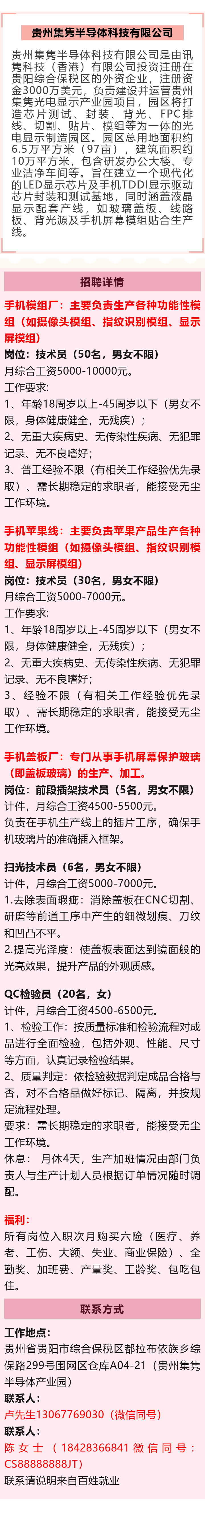 贵州集隽半导体科技有限公司招聘手机模组厂、苹果线、盖板厂招聘111人!六险!