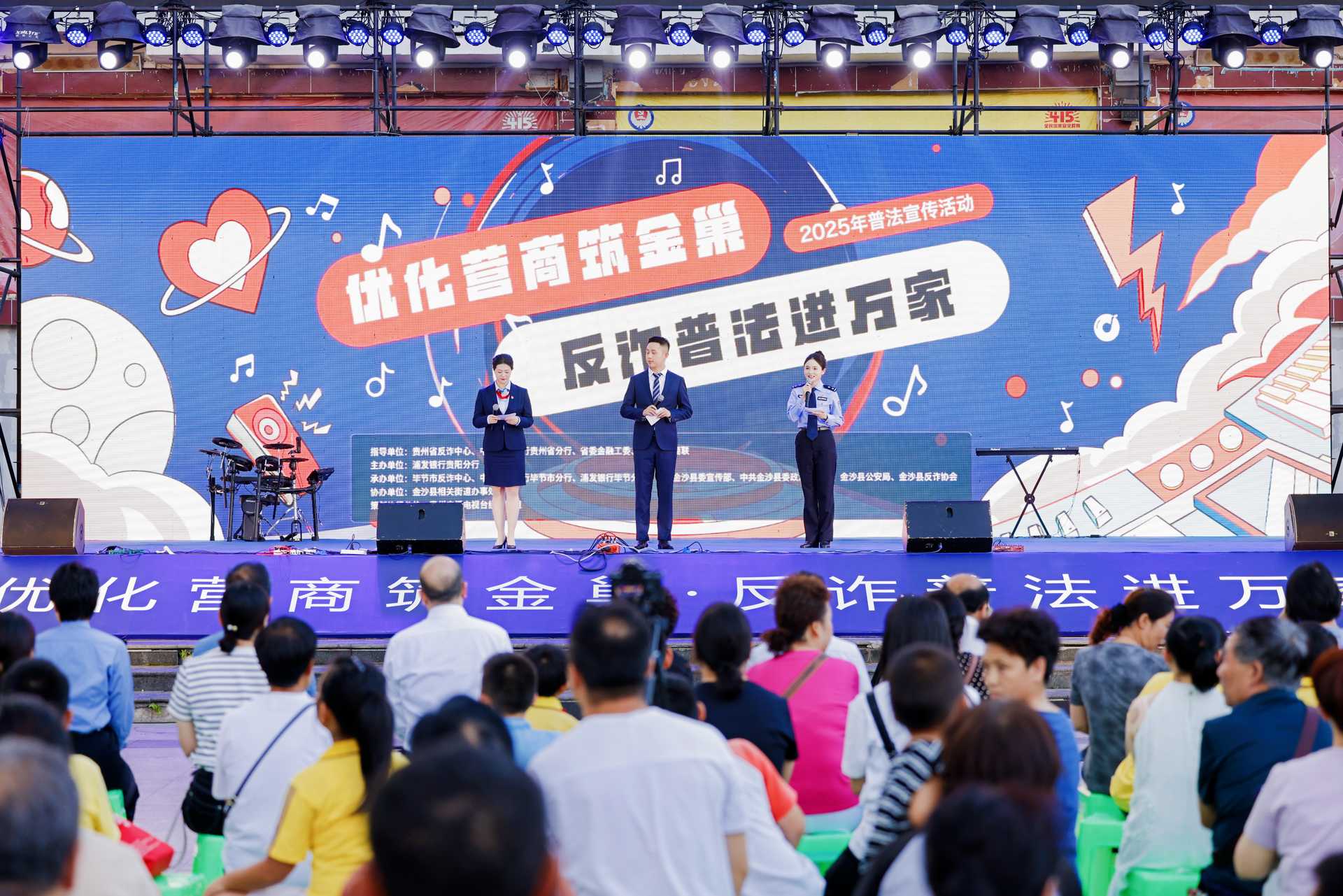 为持续营造全民反诈、全社会反诈的浓厚氛围,增强人民群众的识骗意识和防范能力,值此全省普法宣传月之际,省打击治理电信网络诈骗工作协调机制办公室统筹推动全省反诈宣传专项工作。2025年6月13日,中国人民银行贵州省分行、贵州省委金融工委、浦发银行贵阳分行联合贵州省、市、县反诈中心、贵州省工商业联合会、金沙县委宣传部、县委政法委及相关部门、反诈协会等二十余家单位及民间社会组织在金沙县鼓韵广场共同举办“优化营商筑金巢 反诈普法进万家”暨2025年普法宣传主题活动。