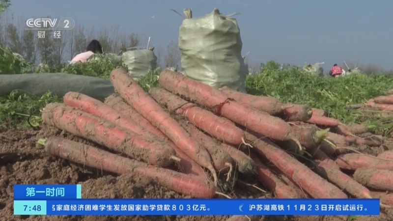 在陕西渭南大荔县朝邑镇的红萝卜种植基地,专业的收割机将一根根红萝卜从地里刨出。工人们紧随其后清理缨叶、采收装袋。一排排红萝卜被码放整齐,随后将装箱运往周边批发市场。