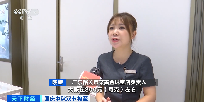 广东韶关市某黄金珠宝店负责人 晓旋:上周(店铺优惠后)金价大概在800元(每克)左右,现在黄金价格是1048元(每克),我们做国庆活动优惠完是868元(每克)。