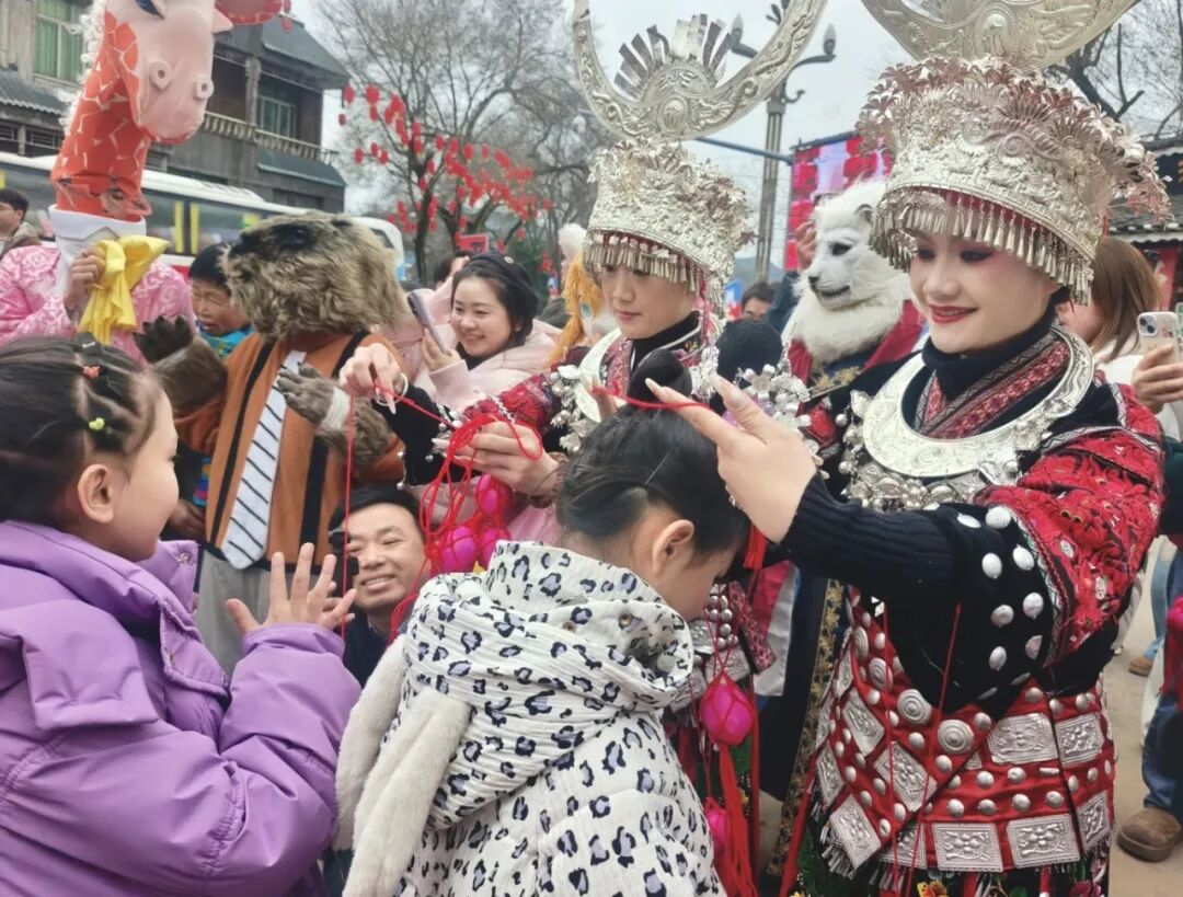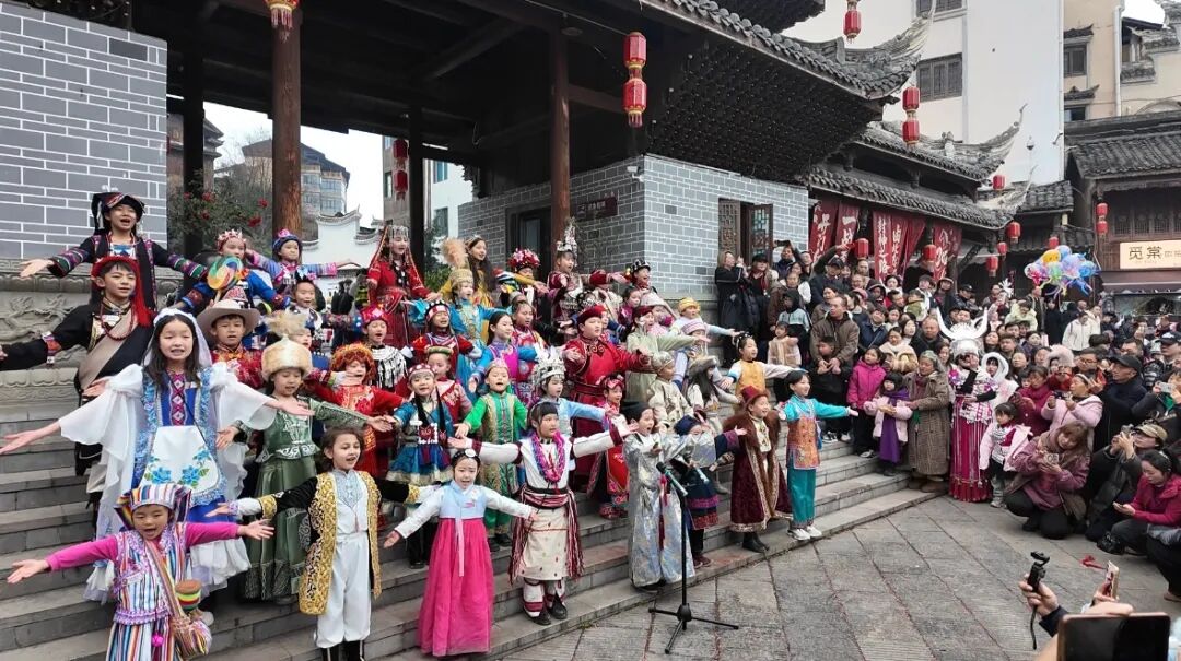 离开苗侗风情园,小演员们又来到古韵悠然的下司古镇。青石板路蜿蜒延伸,非遗工坊、民俗体验点错落分布,悠扬的芦笙声响彻街巷,诉说着黔东南的古老故事。在古镇文化广场,小演员们即兴表演春晚节目《吉量》,欢快的舞步、灿烂的笑容、真挚的歌声,瞬间吸引了众多乡亲与游客驻足围观。