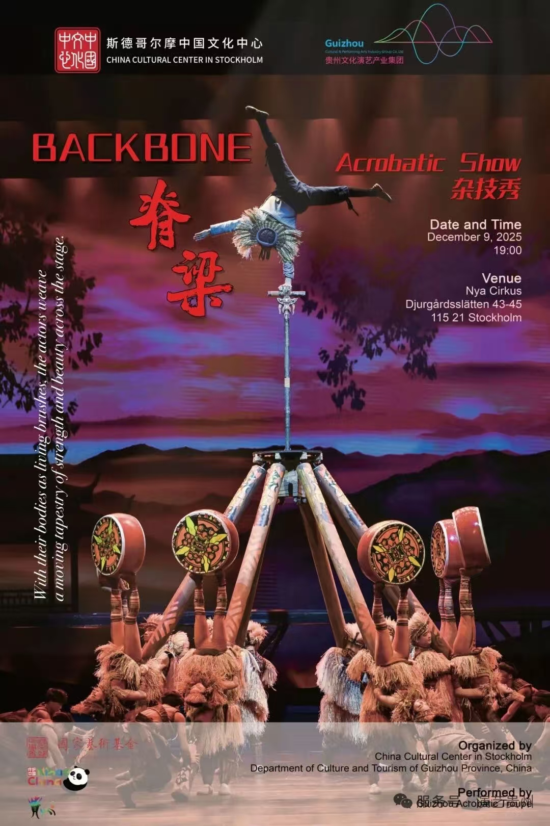 近日,由贵州省杂技团创排的《脊梁》在瑞典斯德哥尔摩新马戏剧场(Nya Cirkus)成功上演,为当地观众带来了一场融合中国民族特色与杂技艺术魅力的文化盛宴。此次演出由斯德哥尔摩中国文化中心与贵州省文化和旅游厅联合举办,800余名瑞典各界友人、多国驻瑞使节及旅瑞侨胞齐聚现场,共同感受贵州文化的独特魅力。