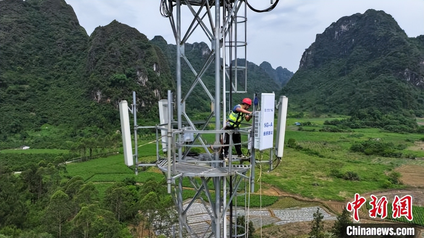 图为中国移动网络保障人员安装5G- A通感基站。广东移动供图