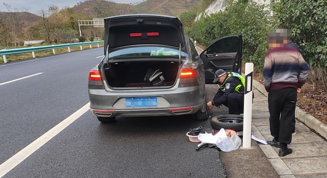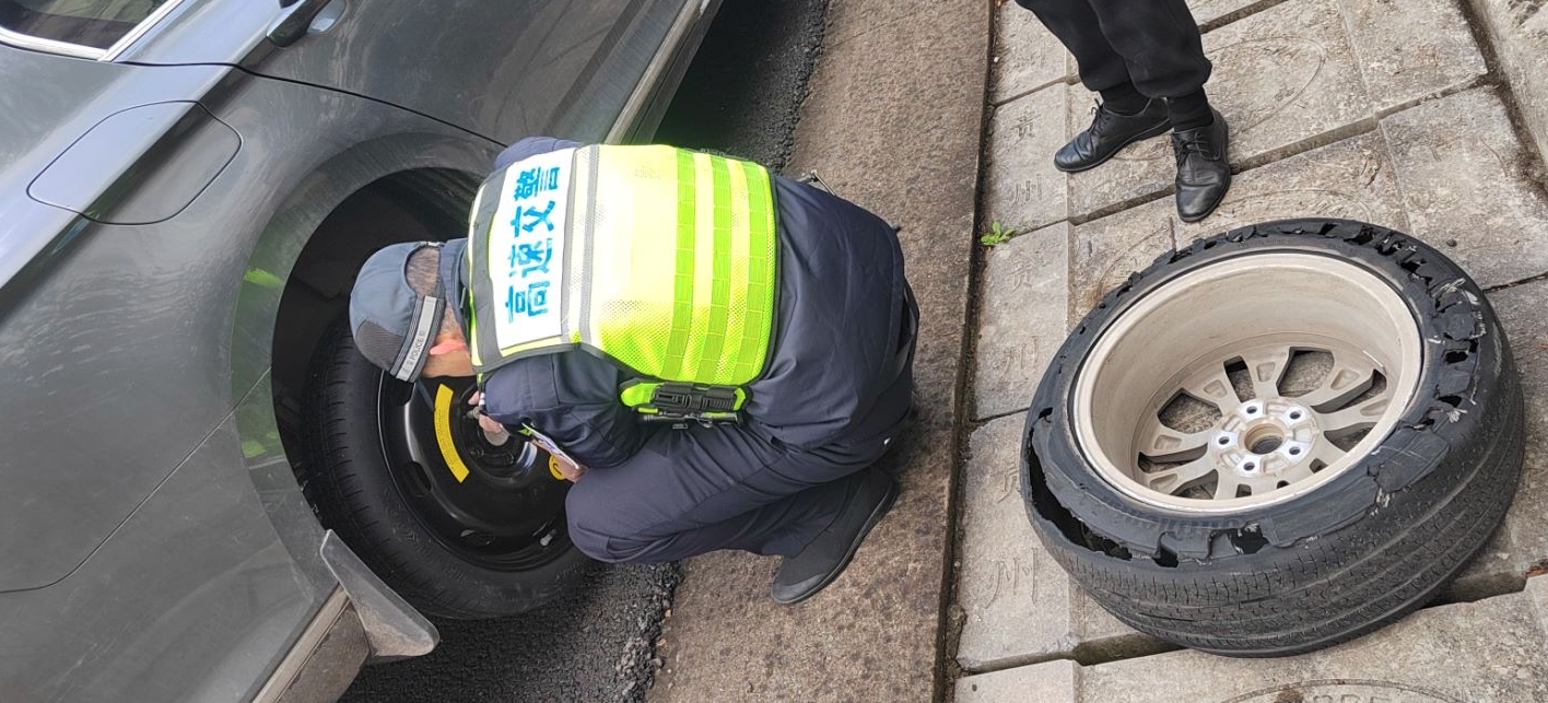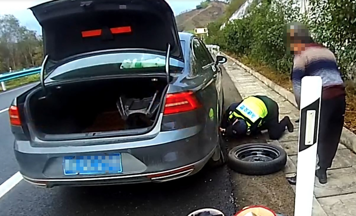 据驾驶人称,自己驾车从望谟西收费站出发往望谟南方向,行驶至距离望谟南收费站还有2公里处时,发现车辆右后轮爆胎,但由于自己手指痛风复发,无法自行更换车胎。