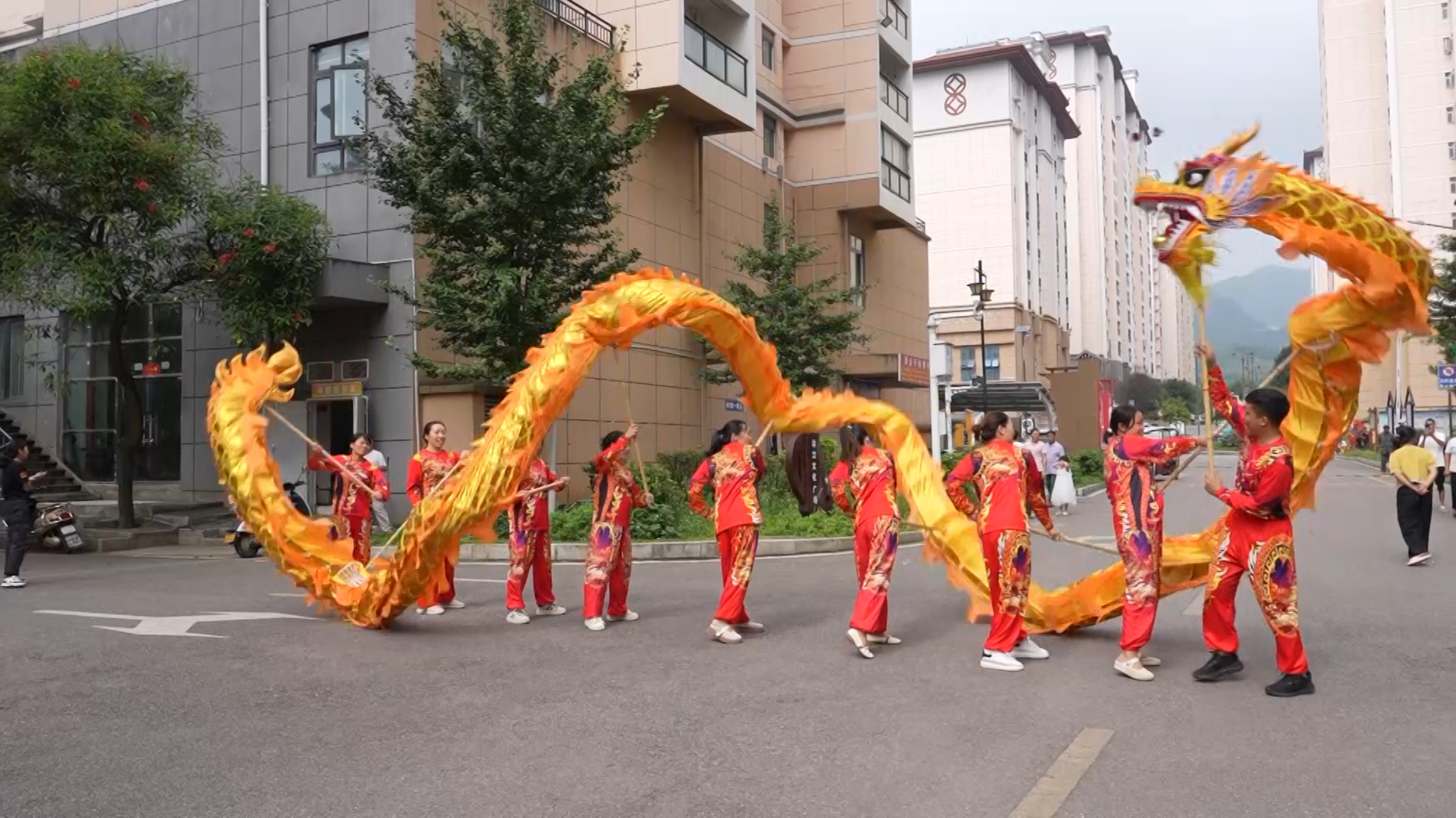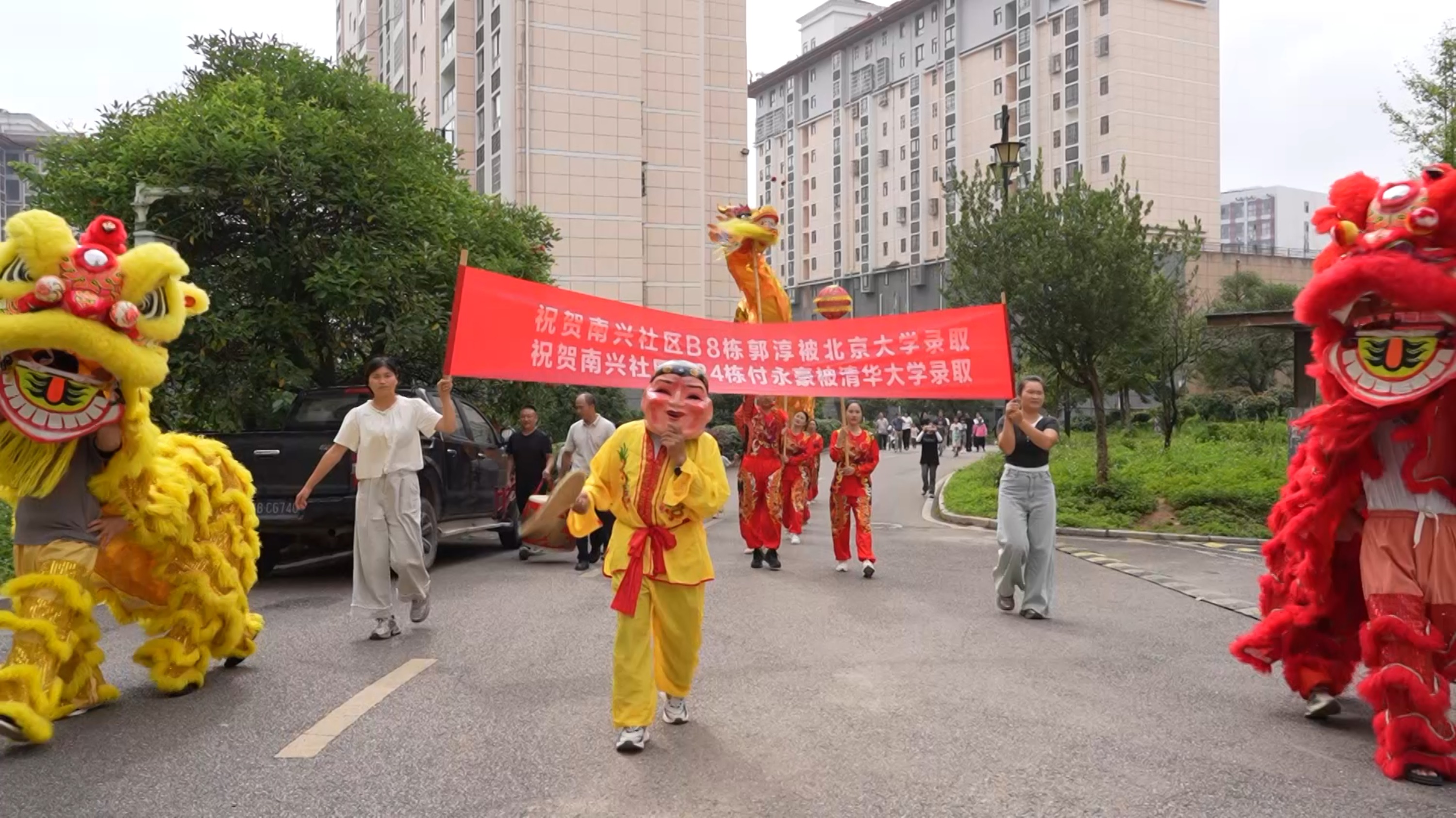 “我们一个小小的社区,今年考上了一个清华、一个北大,太开心、太自豪了,我们必须要敲锣打鼓的来庆祝一下,让社区其他娃娃以他们为榜样,努力学习。”洒金街道南兴社区舞龙文艺队成员李勇说。
