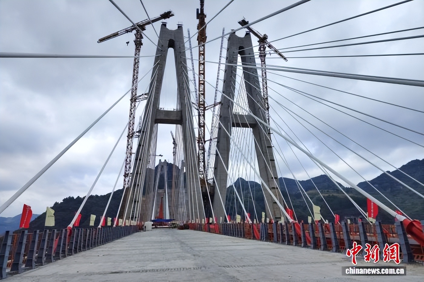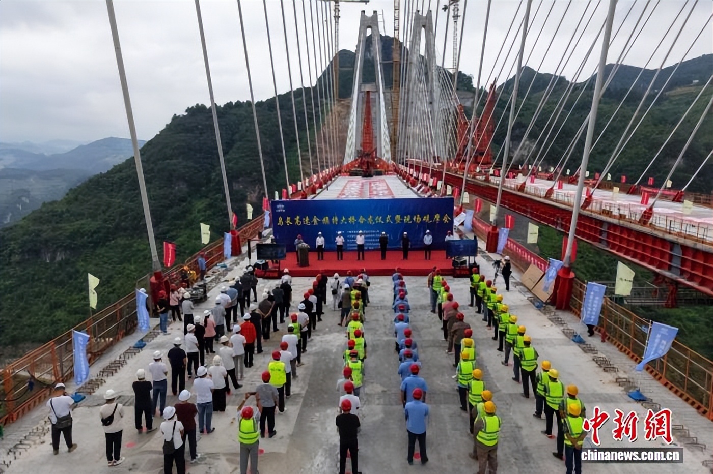 5日,贵州乌当(羊昌)至长顺高速公路(以下简称:乌长高速)控制性工程——金旗特大桥实现顺利合龙。大桥在塔梁固结体系的双塔双索面斜拉桥类型中,建设规模与桥梁高度均为世界第一。