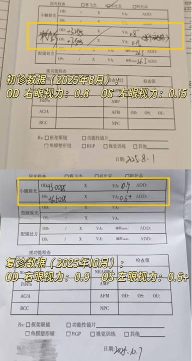 该方案融合了奥视精细刺激、VR头盔沉浸式训练、Gabor斑等多种前沿技术,旨在刺激其左眼视神经发育,提升大脑视觉信息处理能力。在医护人员与家长的共同努力下,乐乐坚持认真完成训练师每次训练量身定制的小任务。至2025年10月7日复查时,视力已成功提升至0.6,为他的学习和生活扫除了视觉障碍。