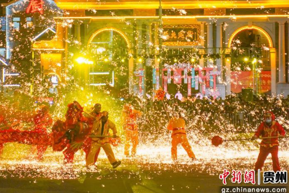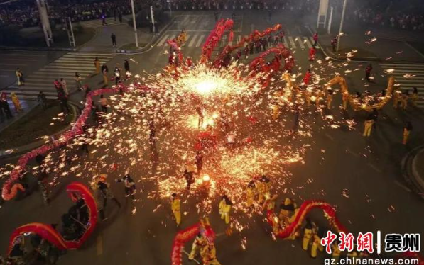 从初一到十五,遵义乌江寨推出“寨龙赛”,18条传承尚嵇古镇“囤灯”民俗的祥龙破壁而出,在梯田与吊脚楼间展开村落博弈,舞龙博弈,这不仅是一场民俗盛宴,更是一次传统文化的传承与发扬。每条龙均保留独特扎制风格与舞动套路,或刚劲迅猛,或灵动飘逸。夜幕降临后,非遗板凳龙在梯田广场蜿蜒游弋,灯火璀璨;非遗打铁花与星空无人机秀点亮夜空,让千年民俗在文旅融合中焕发新生。