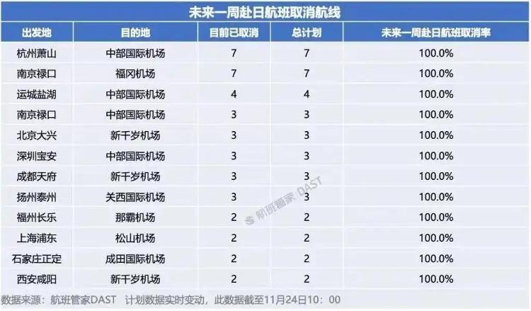 航班管家DAST的最新数据显示,截至11月24日10时,已有12条中日航线取消所有航班。此前,国内已有多个航空公司相继发布《关于日本相关航线客票特殊处理的通告》。