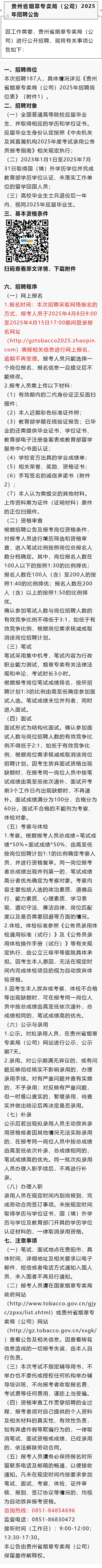 【国企】贵州省烟草专卖局招聘187人!报名截止时间:2025年4月15日!