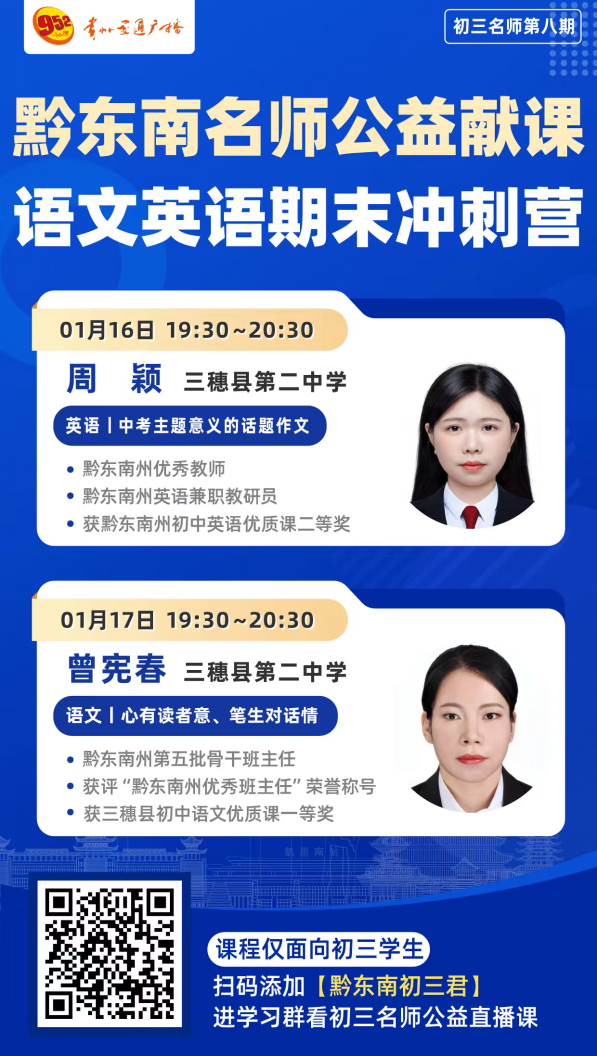 1月16日本周五、1月17日本周六每晚19:30,贵州广播电视台交通广播《黔东南名师公益课》系列重磅推出第八期语文英语期末冲刺营。
