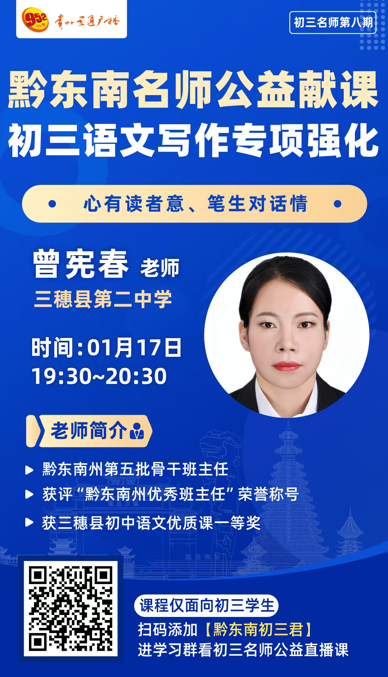 为深化教育教学改革、共享优质教育资源,助力初三学子精准突破学习难点,提升备考效率,贵州广播电视台交通广播联合黔东南州教育系统,持续推出“黔东南名师公益课”。