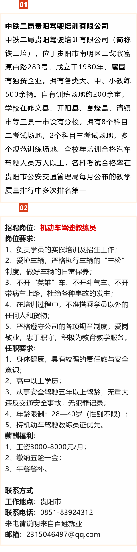 中铁二局贵阳驾驶培训有限公司招聘!月薪可达8000元!五险一金、餐补!