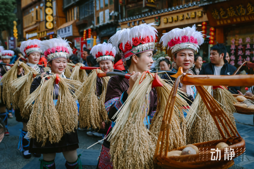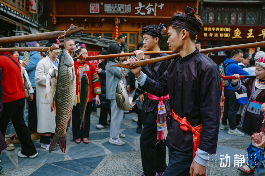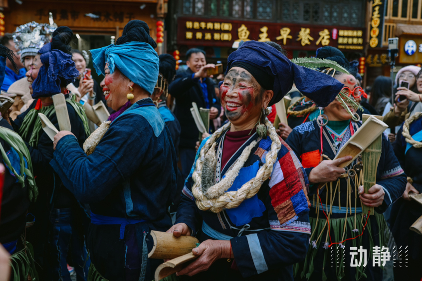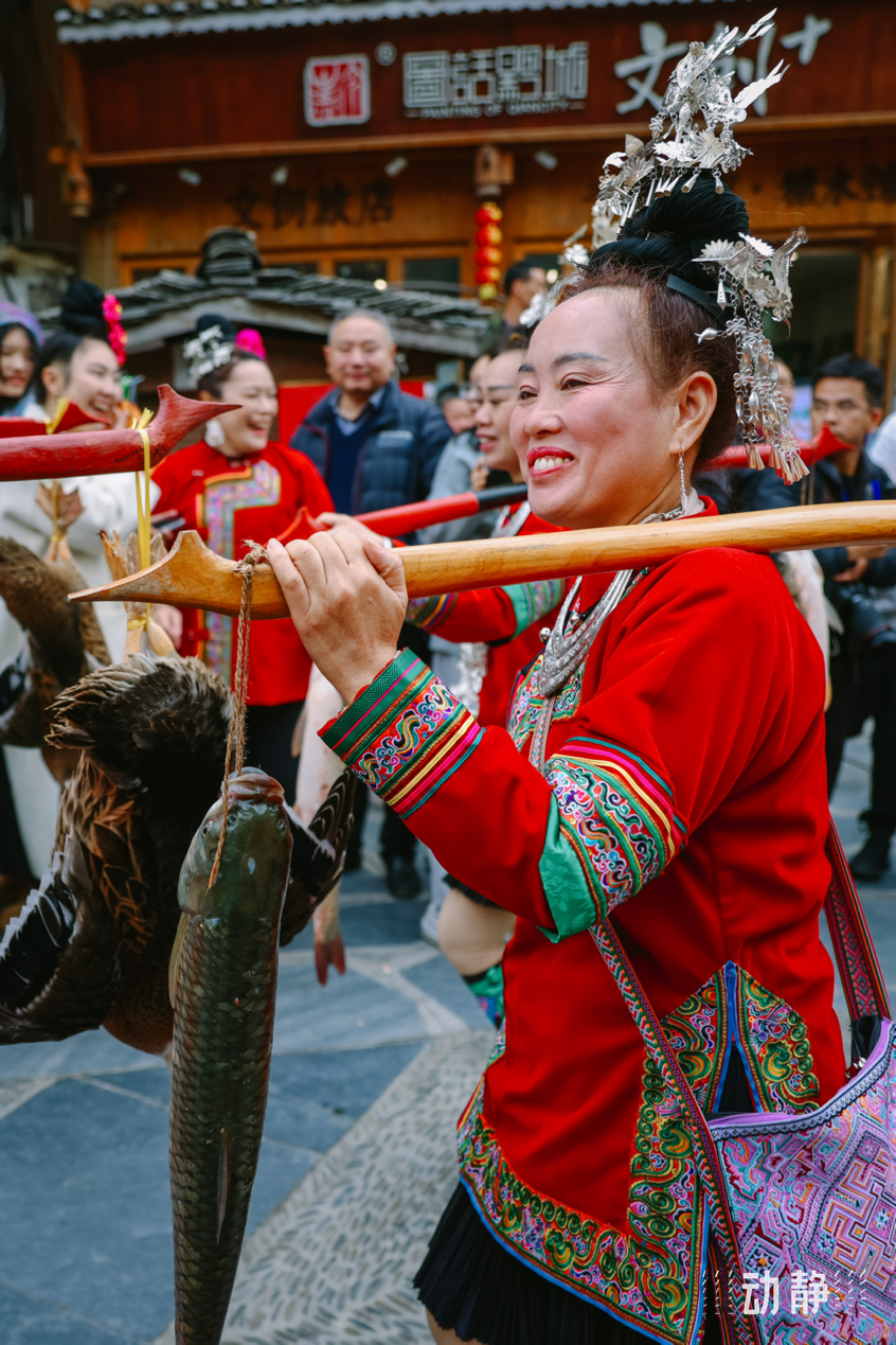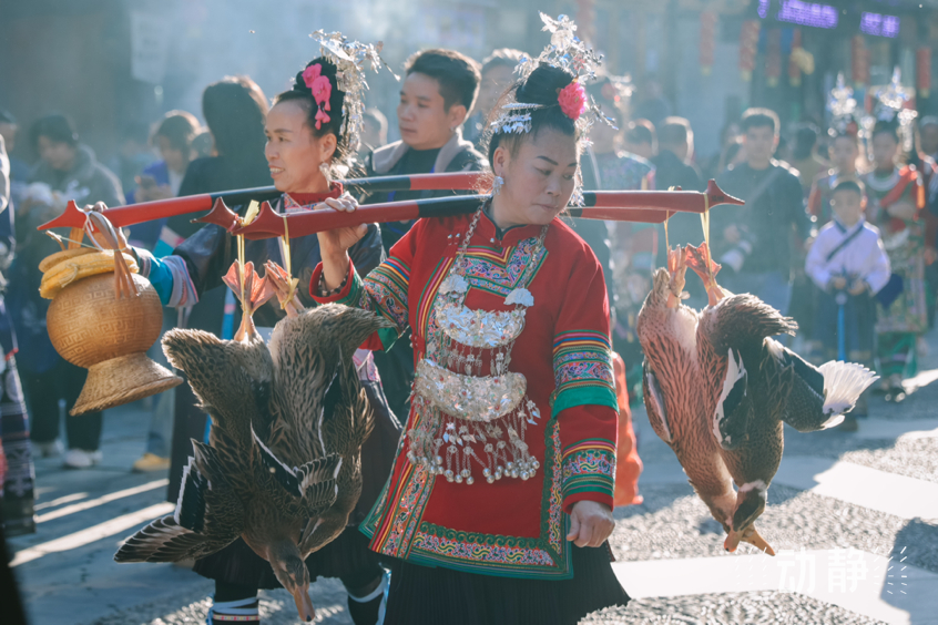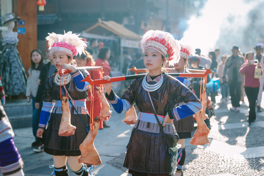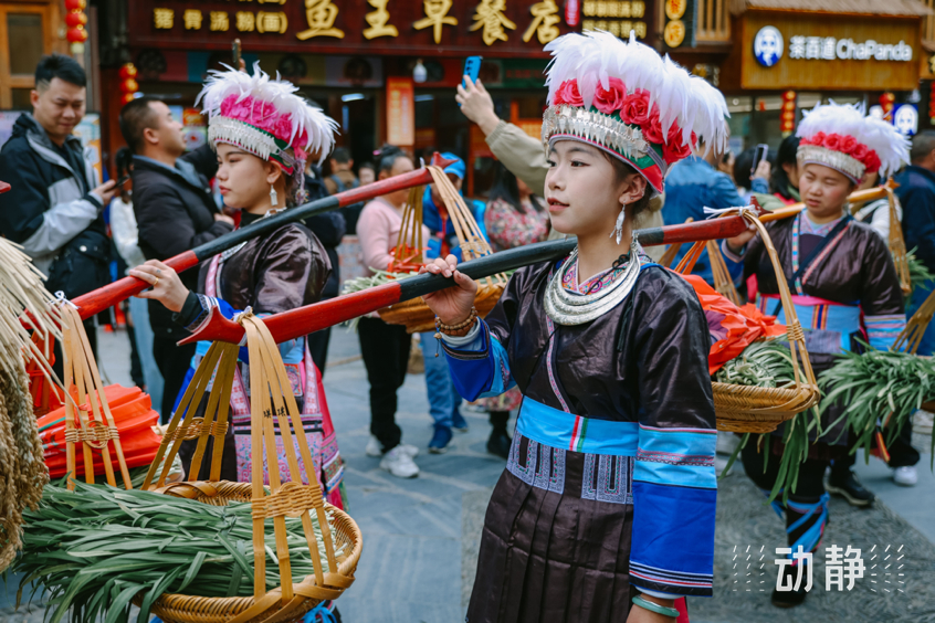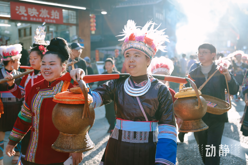 巡游活动中,身着特色民族服饰的侗族群众组成长队,有的吹着芦笙、弹起牛腿琴、琵琶等侗族乐器唱着侗歌,有些则挑着侗家糍粑美食,展示丰富多彩的民族文化和饮食文化,与肇兴侗寨的传统建筑交相辉映,构成了侗年亮丽的风景。