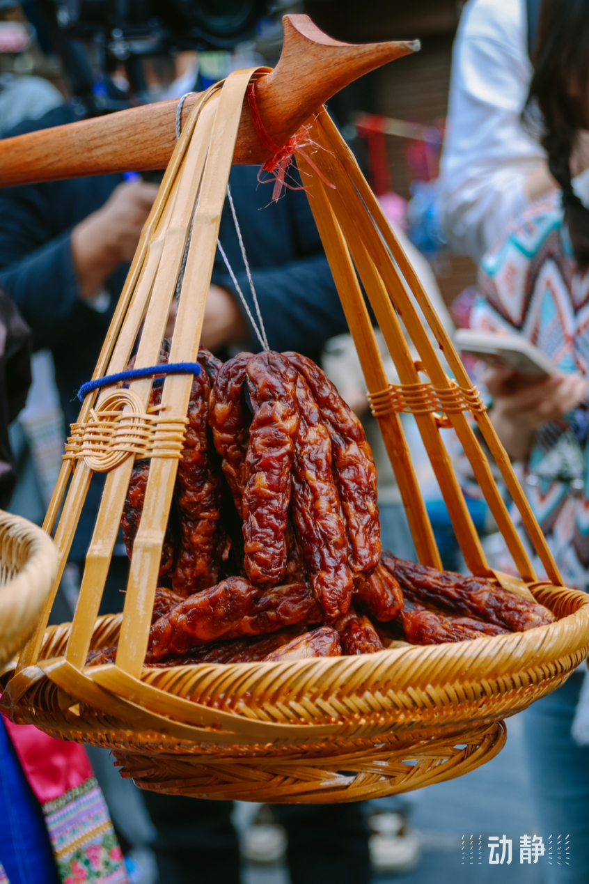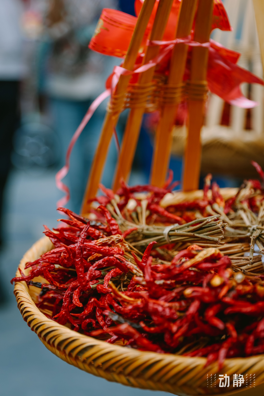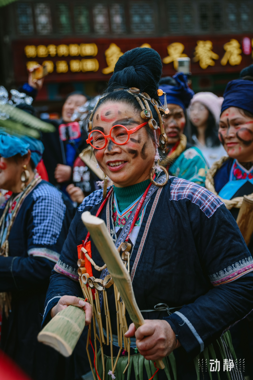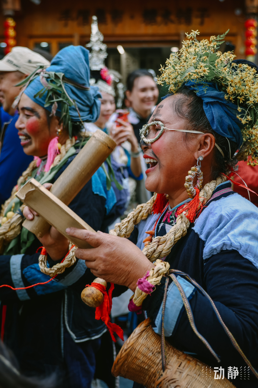 巡游活动中,身着特色民族服饰的侗族群众组成长队,有的吹着芦笙、弹起牛腿琴、琵琶等侗族乐器唱着侗歌,有些则挑着侗家糍粑美食,展示丰富多彩的民族文化和饮食文化,与肇兴侗寨的传统建筑交相辉映,构成了侗年亮丽的风景。