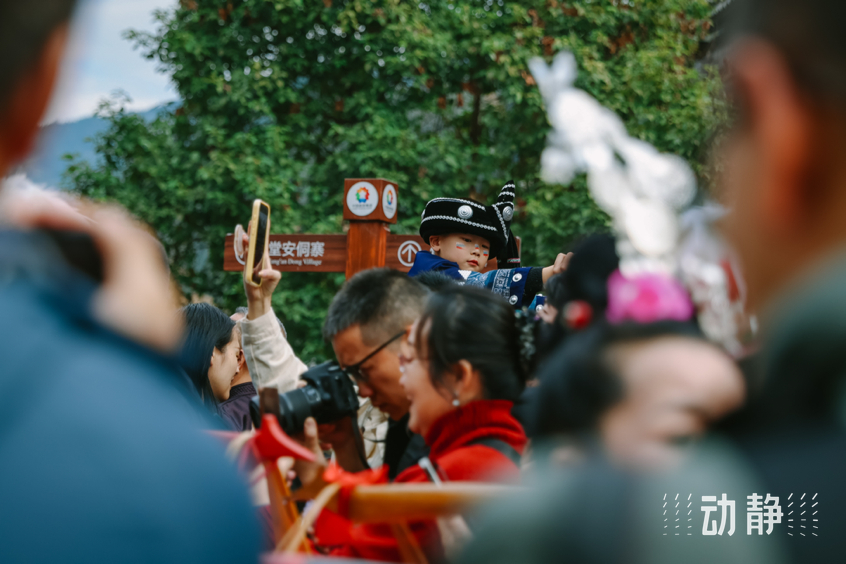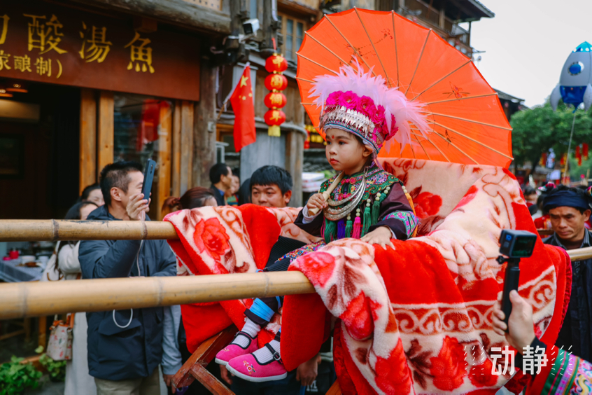 队伍中,一男一女两位小朋友坐在马轿上,由村民抬着在村子里巡游,这是侗族特有的“抬官人”民俗活动,“抬官人”通过夸张的表演再现本族古代生活的场景, “官人”通常由村寨里的小孩装扮坐轿。