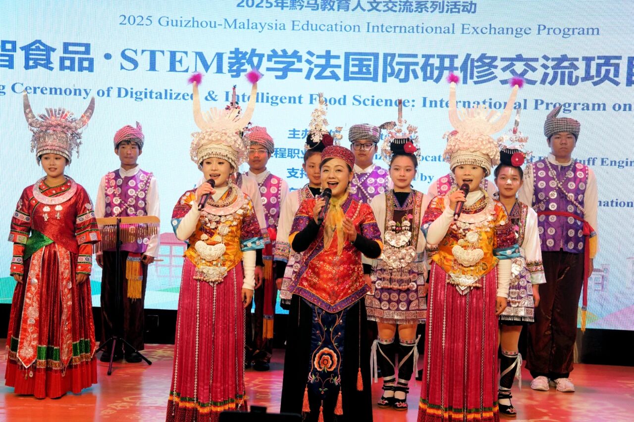 结营仪式上,一场别开生面的文艺展演为本次研修交流画上圆满句号。黔马双方师生联袂登台,学院师生带来苗族飞歌、侗族大歌等非遗歌舞表演,展现少数民族文化的鲜活生命力,PTSN教师则通过马来西亚传统武术与歌曲表演,传递异国文化的独特风情。舞台上,不同语言的歌声交织,不同风格的舞步相融,成为双方文化互鉴的生动缩影。