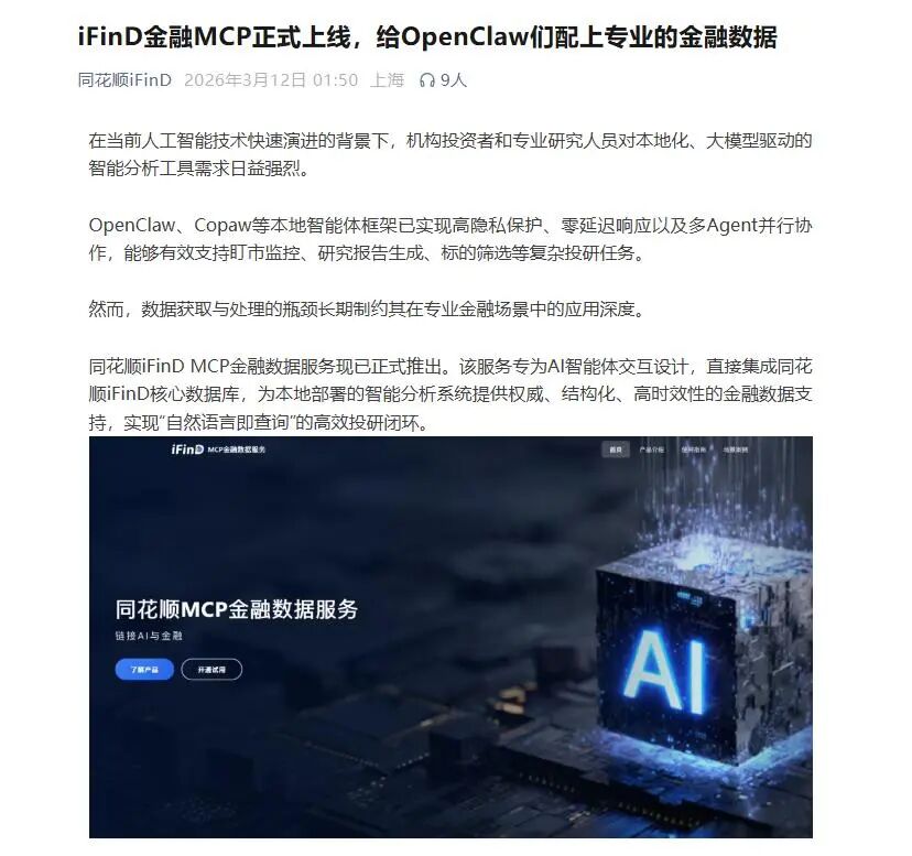 除了Wind,同类金融软件同花顺12日凌晨也宣布,同花顺iFinD金融MCP正式上线,给OpenClaw们配上专业的金融数据。该服务专为AI智能体交互设计,直接集成同花顺iFinD核心数据库,为本地部署的智能分析系统提供权威、结构化、高时效性的金融数据支持,实现“自然语言即查询”的高效投研闭环。