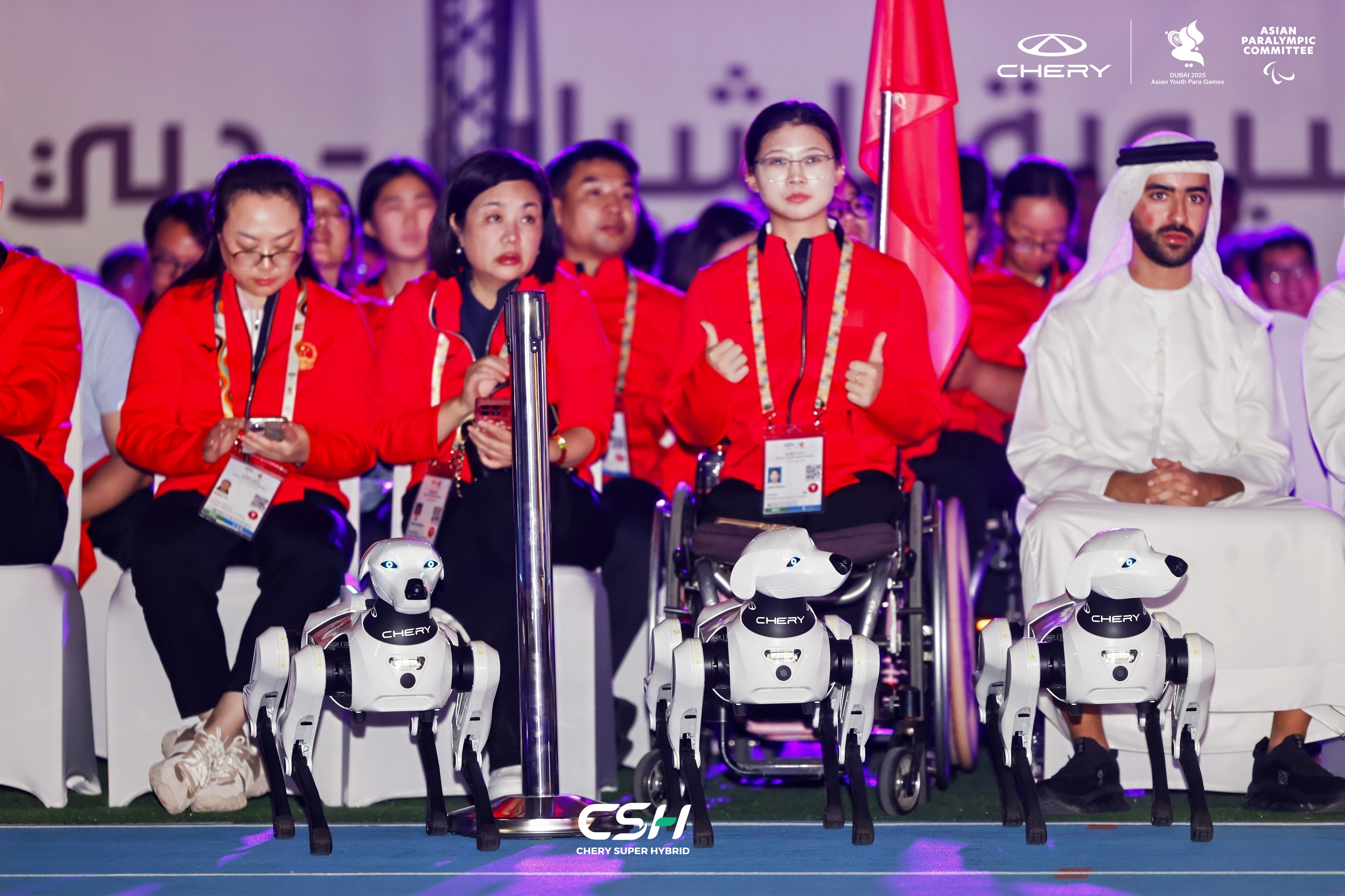 在开幕式上,智能机器人“墨茵”作为本次赛事奇瑞指定发言人,与亚洲残奥委员会主席 Majid Rashed 及迪拜皇室成员亲切互动,共同为本届亚青残运会启幕。机器狗 (Argos) 则以“代表团领队伙伴”的身份陪伴运动员列队入场,收获阵阵喝彩。“墨茵”更是在与会嘉宾的交流中使用中文、英语、阿拉伯语、马来语等9种语言与嘉宾及观众交流,展现了奇瑞科技实力。