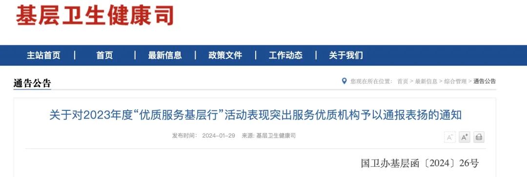 近日,国家卫生健康委发布关于对2023年度“优质服务基层行”活动表现突出服务优质机构予以通报表扬的通知。国家卫生健康委、国家中医药局决定对在2023年度“优质服务基层行”活动中表现突出、服务优质的机构予以通报表扬。我省贵阳市花溪区青岩卫生院、遵义市仁怀市三合镇卫生院等65所机构名列其中。具体通知如下:
