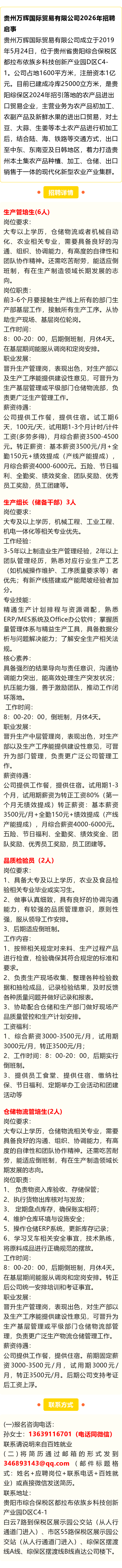 贵州万辉国际贸易有限公司招聘生产管培生、生产组长(储备干部)、仓储物流管培生等岗位!