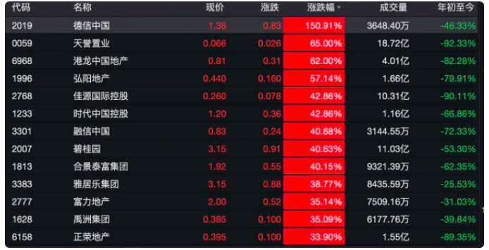 港股表现更加兴奋,内房股亦普遍高开, 恒生地产建筑业指数以7.97%的涨幅居于各指数之首,89只成分股无一下跌,更16只地产股涨幅超30%。其中,德信中国涨幅为最大,超150%,天誉置业、港龙中国涨幅超60%,碧桂园、合景泰富涨幅超40%,雅居乐集团、富力地产、正荣地产也分别录得超30%的涨幅。