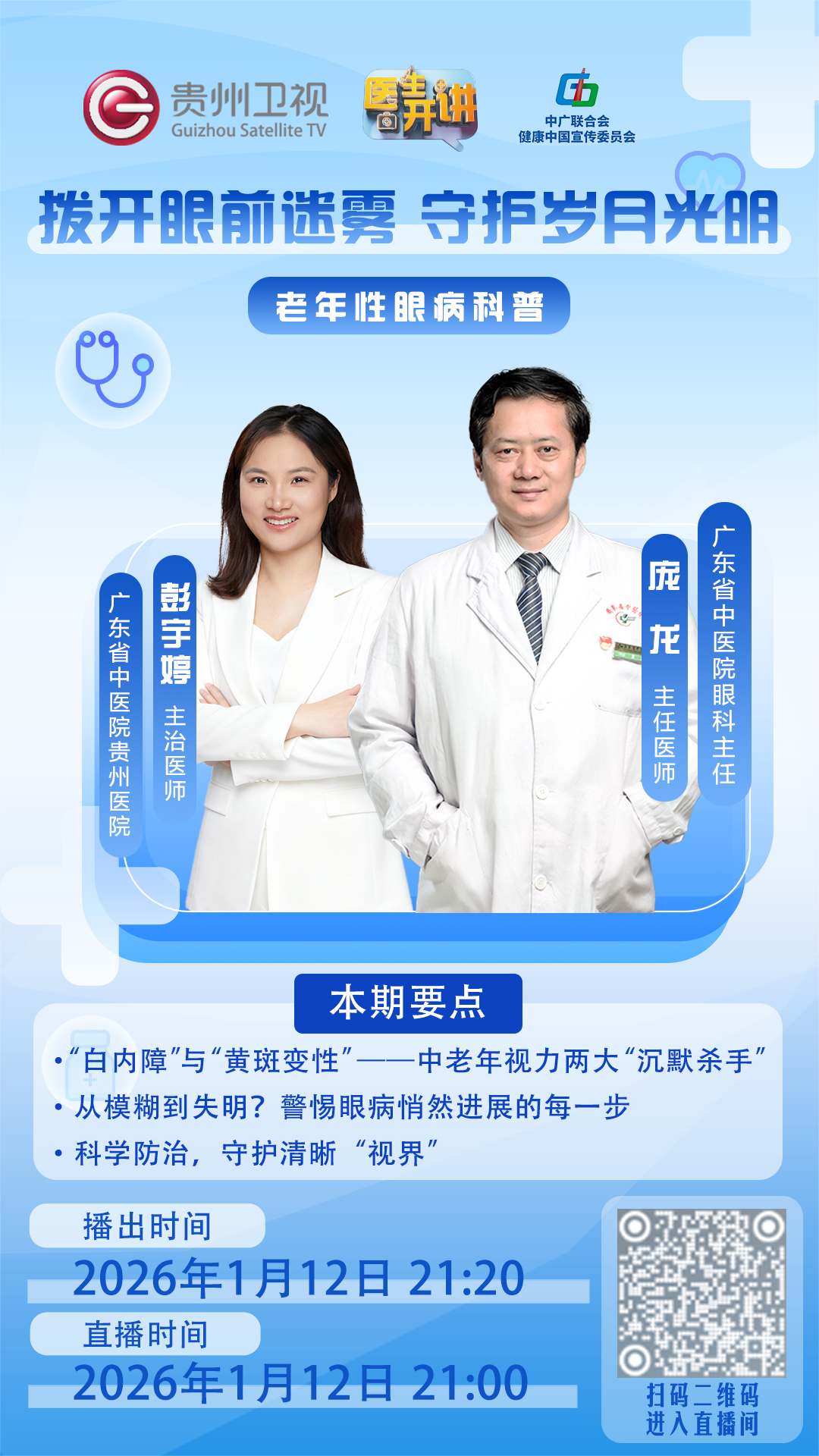 本期《医生开讲》特邀广东省中医院贵州医院眼科专家——庞龙主任与彭宇婷医生,带您深入认识老年性白内障与黄斑病变。专家将用生动比喻解析两者的根本区别,揭示其典型症状与高危因素,并分享实用的居家自查方法与日常护眼指南。