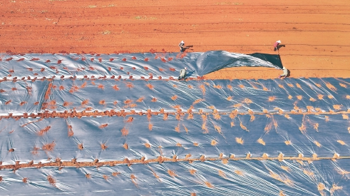 近年来,江西省吉安市永丰县积极引导农民调整产业结构,采取“党支部+基地+农户”模式,大力发展百香果、猕猴桃等产业,带动农民增收致富。图为农民正在整地覆膜,准备移栽百香果秧苗。刘浩军 摄(来源:大国三农)