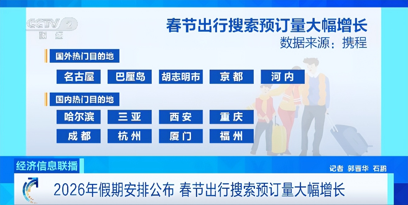 11月4日,国务院办公厅发布了《关于2026年部分节假日安排的通知》。其中,春节安排放假9天。记者从多个旅游平台了解到,消息刚刚发布,春节出行旅游的搜索量和预订量就出现快速增长。