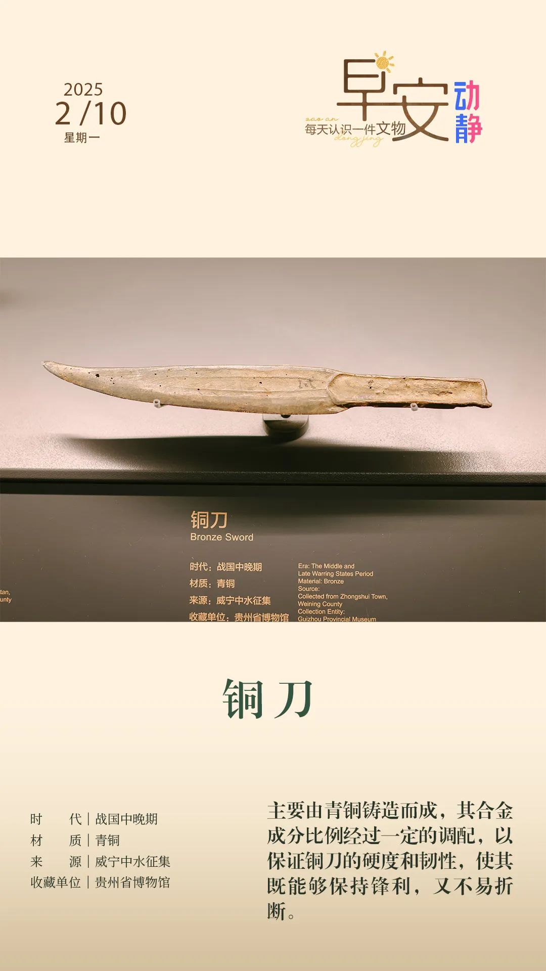 带有明显的西南地区夜郎文化或当地土著文化的特征,可能与周边地区如滇文化、巴蜀文化等有一定的交流和融合,在造型、纹饰等方面体现出独特的地域风格。从功能上看,主要用于日常生产生活中的切割、宰杀等活动,也可能作为防身或战斗的武器。在文化上,铜刀可能具有一定的象征意义,如代表着使用者的身份、地位或权力,也可能与当时的宗教信仰、祭祀仪式等有关。