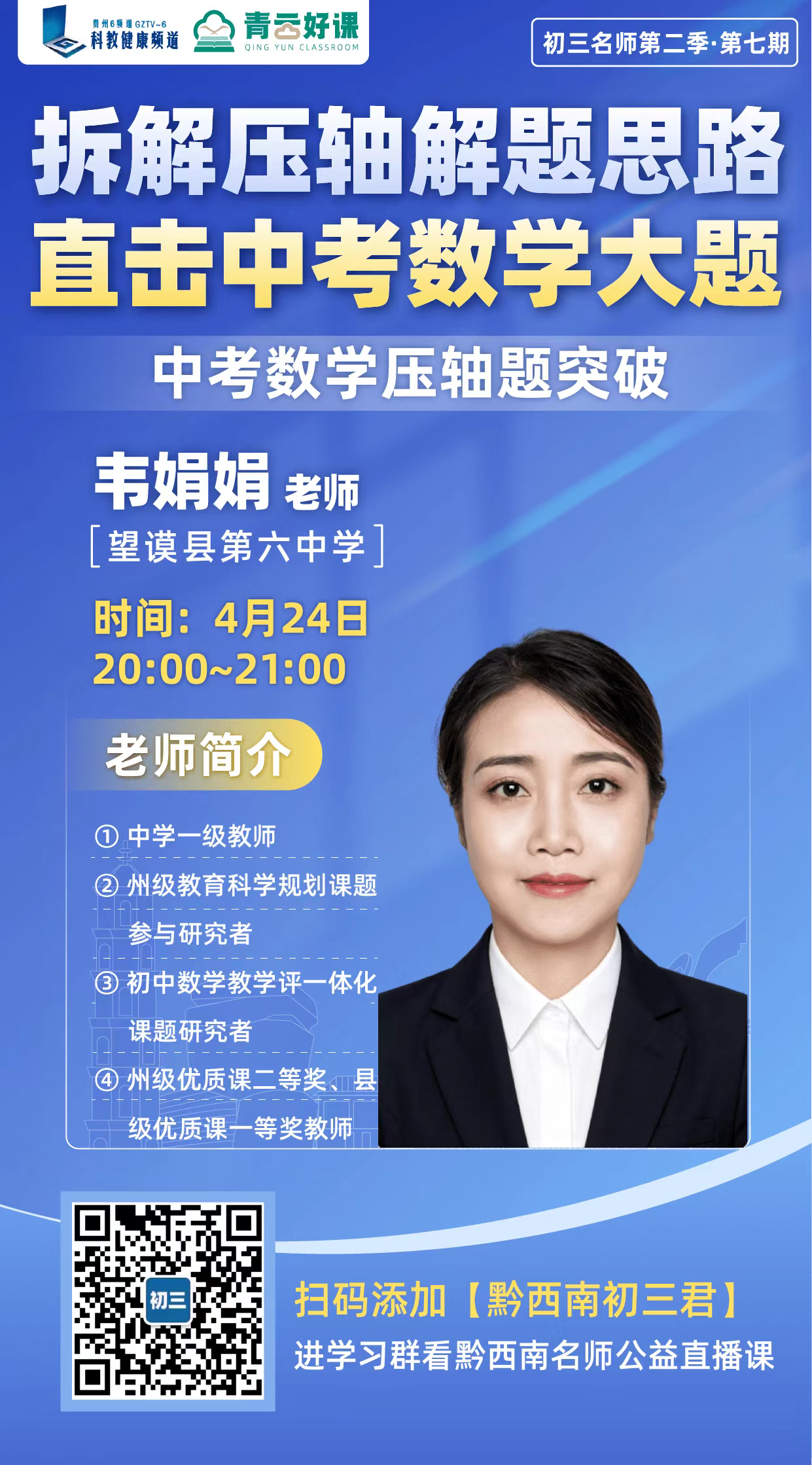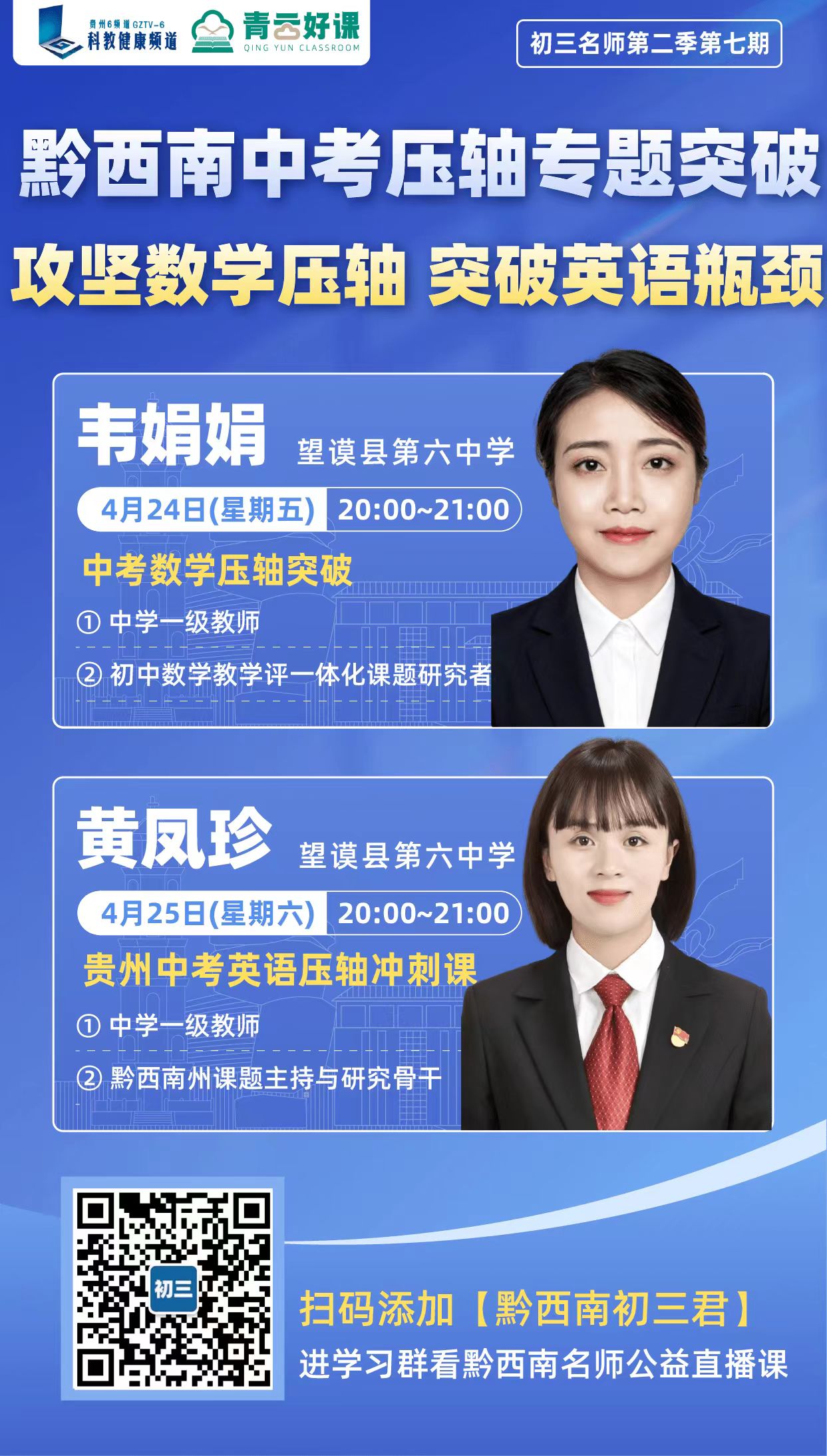 本周“青云好课”为中考数学、英语中考压轴专题,我们邀请到望谟县韦娟娟老师和黄凤珍老师,带领大家攻坚数学压轴、突破英语瓶颈!