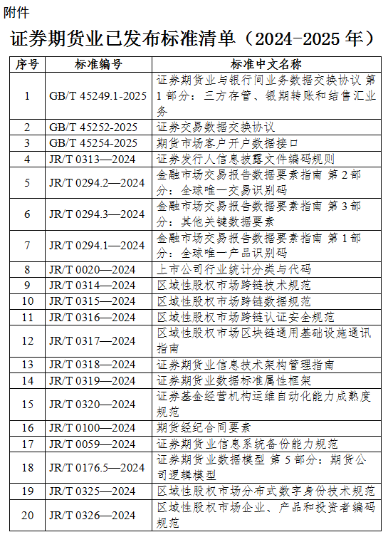 为进一步规范行业发展,提升市场效率,保护投资者权益,中国证监会及相关部门在近两年密集发布了一系列证券期货业标准。这些标准的实施,将为行业的高质量发展奠定坚实基础。
