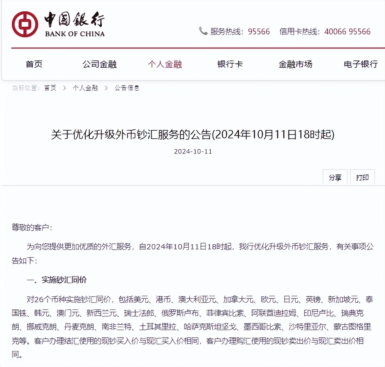 10月11日,中国银行宣布,优化升级外币钞汇服务。自10月11日18时,对26个币种实施钞汇同价,包括美元、港币、澳大利亚元、加拿大元、欧元、日元、英镑、新加坡元、泰国铢、韩元、澳门元、新西兰元、瑞士法郎、俄罗斯卢布、菲律宾比索、阿联酋迪拉姆、印尼卢比、瑞典克朗、挪威克朗、丹麦克朗、南非兰特、土耳其里拉、哈萨克斯坦坚戈、墨西哥比索、沙特里亚尔、蒙古图格里克等。客户办理结汇使用的现钞买入价与现汇买入价相同,客户办理购汇使用的现钞卖出价与现汇卖出价相同。对上述币种免于收取钞汇转换价差,即客户办理现汇账户存取现钞、现汇账户与现钞账户之间划转资金、现钞账户办理跨境汇款等涉及外币钞汇性质转换的交易时,由于实施钞汇同价而免于收取钞汇转换价差。