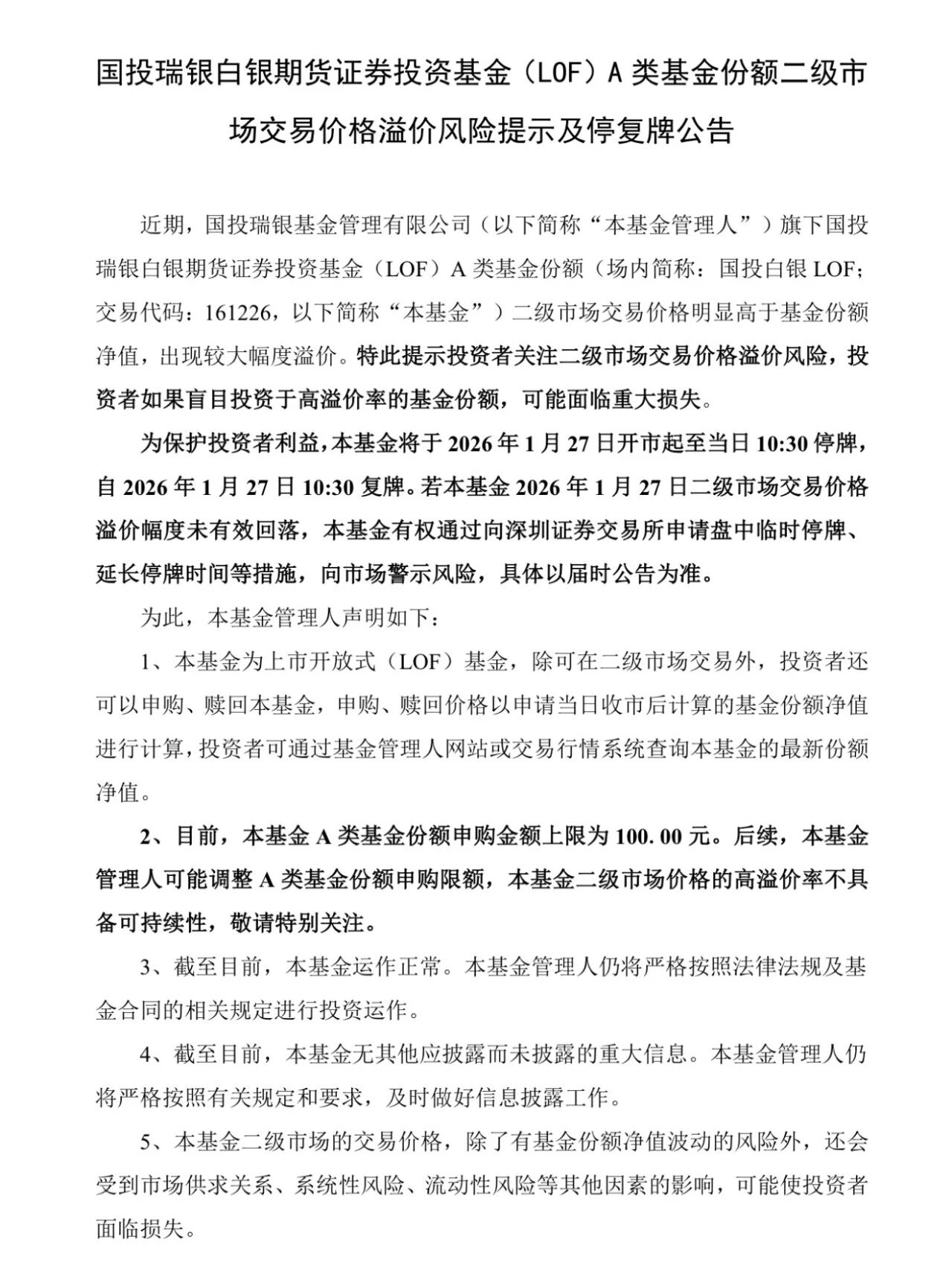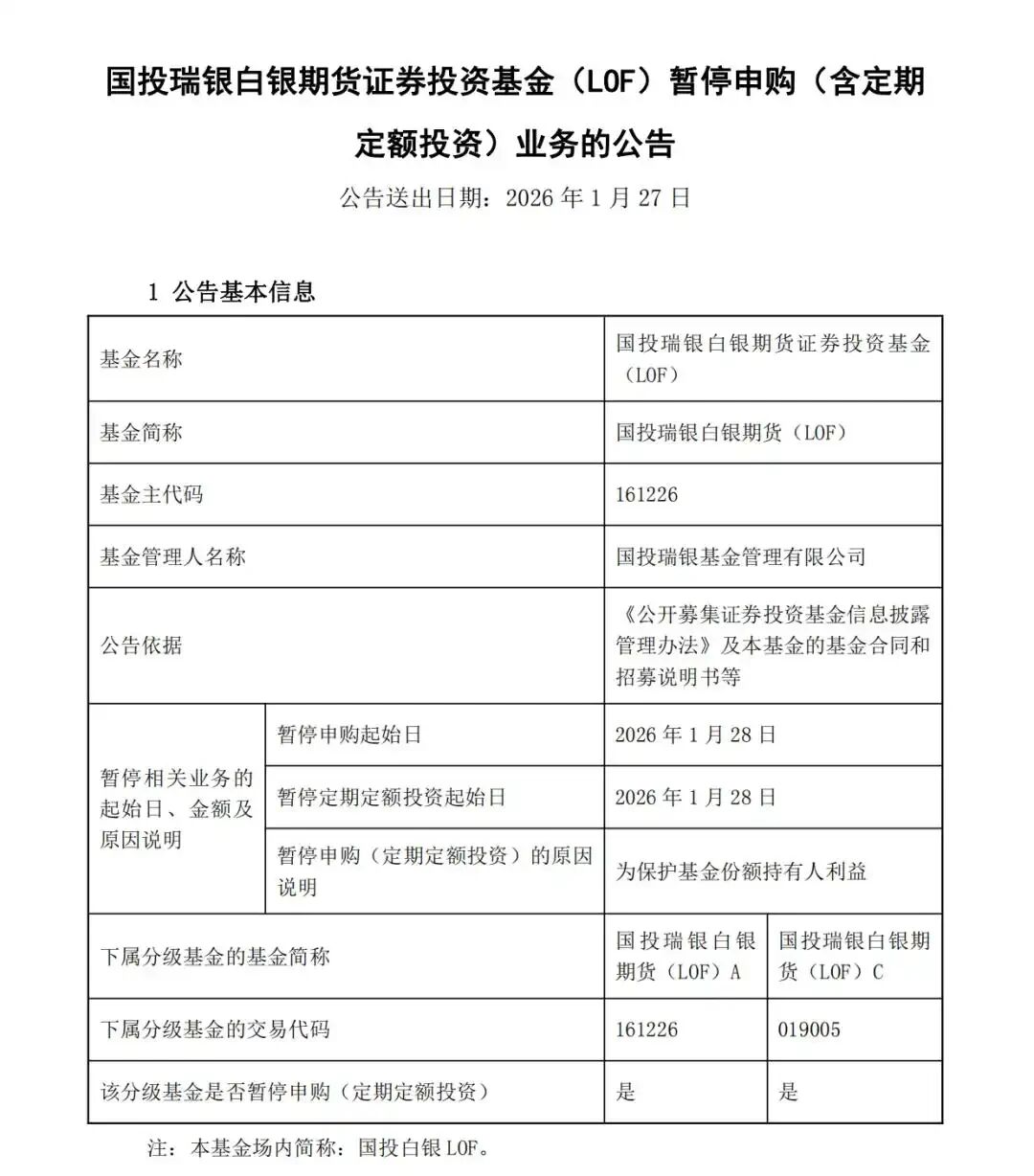 1月26日晚间,国投白银LOF(161226)公告,将于2026年1月28日起暂停申购(含定期定额投资)业务。