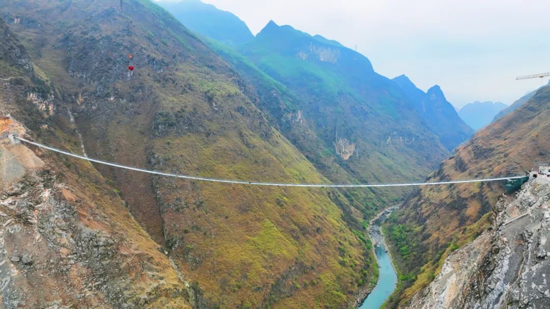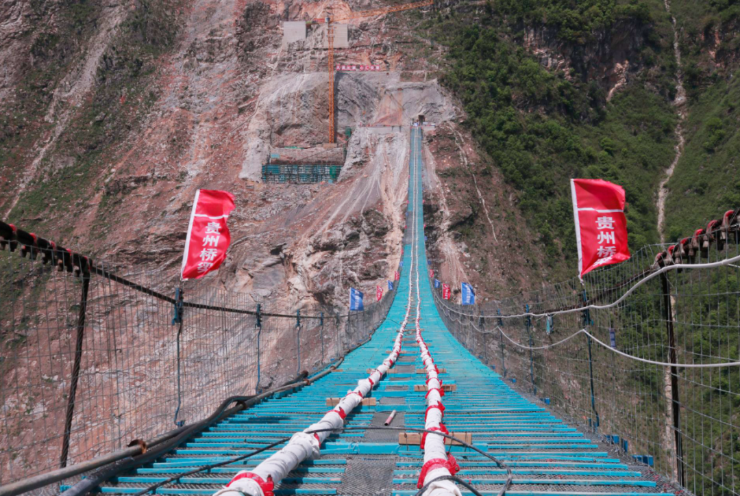 构筑“风中稳索”的空中通道:大跨径、大坡度、柔性的猫道,叠加峡谷强风,对稳定泵送构成严峻挑战。项目团队创新性地构建了“刚性连接—缆风”协同稳定体系,通过多根承重绳组成宽幅平台,并以刚性吊杆连接扶手绳与承重绳,形成空间桁架结构;同时,在索道两侧布设8道缆风,有效抵抗风荷载。此外,团队还建立了猫道结构混凝土泵送管道动态压力损失修正模型,精准优化泵送参数,确保了输送过程的稳定高效。