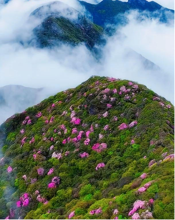 梵净山,正是这场春日仪式最不可替代的会场。它的春天来得早,来得烈。四月,万亩野生杜鹃从山脚烧到云端,粉紫火红铺满原始森林。被誉为“中国鸽子树”的珙桐同时盛开,雪白的花瓣在山风中摇曳,像一群白鸽飞过绿海。云海是每天的常客,雨雾散开的瞬间,阳光穿过树冠,把整座山照得透亮。这不是滤镜能给的,这是梵净山自己准备的春天。