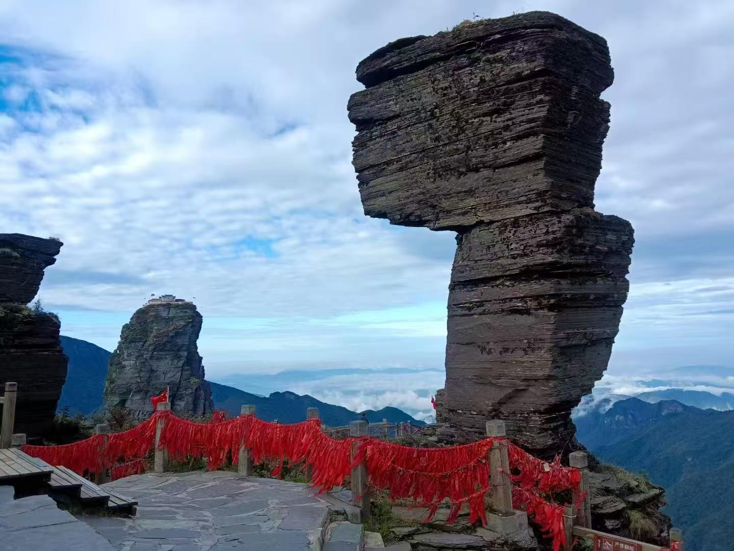 攻略第四条:经典机位——蘑菇石。这块上大下小的石头在风霜中站了十四亿年。地质学家会告诉你,这里曾经是海。你手掌触摸的,是远古海底的年轮。天气好时,蘑菇石与背后的红云金顶同框,是梵净山最经典的画面。