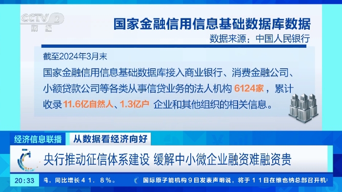 截至2024年3月末,国家金融信用信息基础数据库接入商业银行、消费金融公司、小额贷款公司等各类从事信贷业务的法人机构6124家,累计收录11.6亿自然人、1.3亿户企业和其他组织的相关信息。