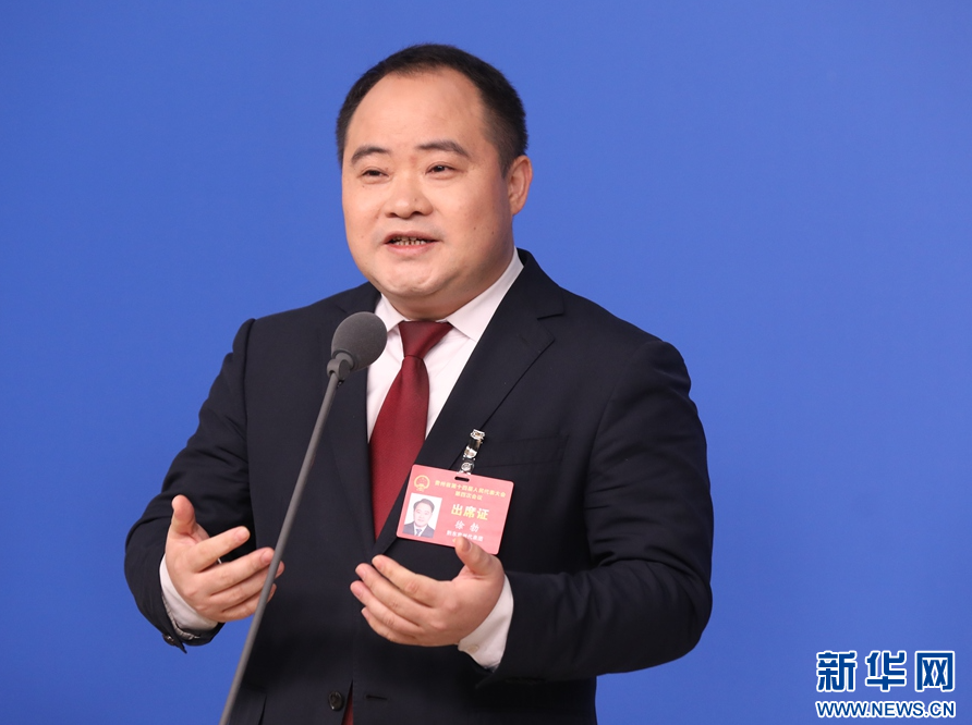 徐勃在“代表通道”接受采访。新华网 周远钢 摄