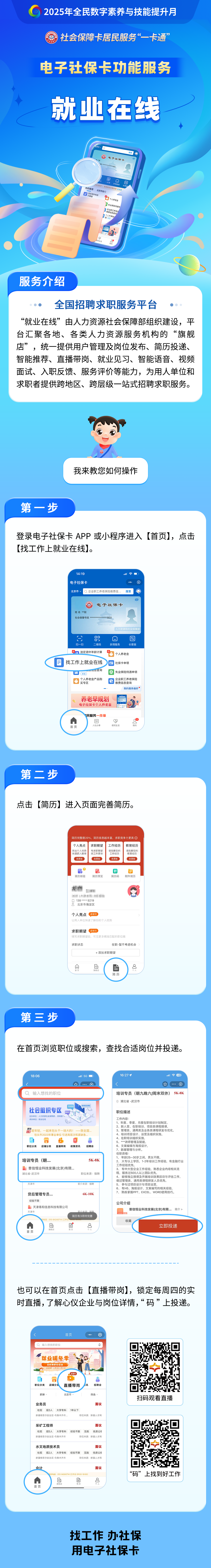 手机上进入电子社保卡APP或小程序后,点击“找工作上就业在线”,查找筛选岗位。