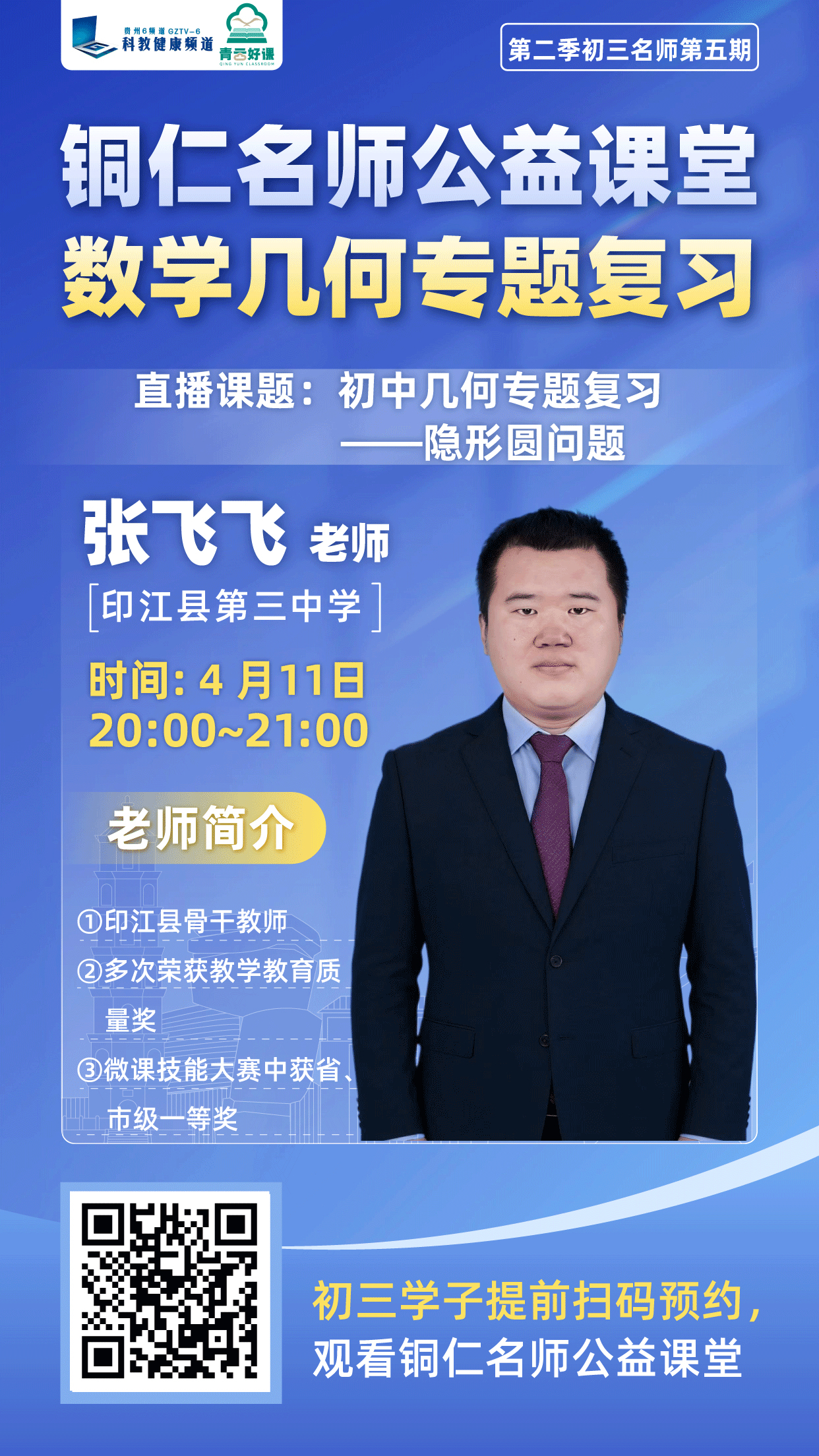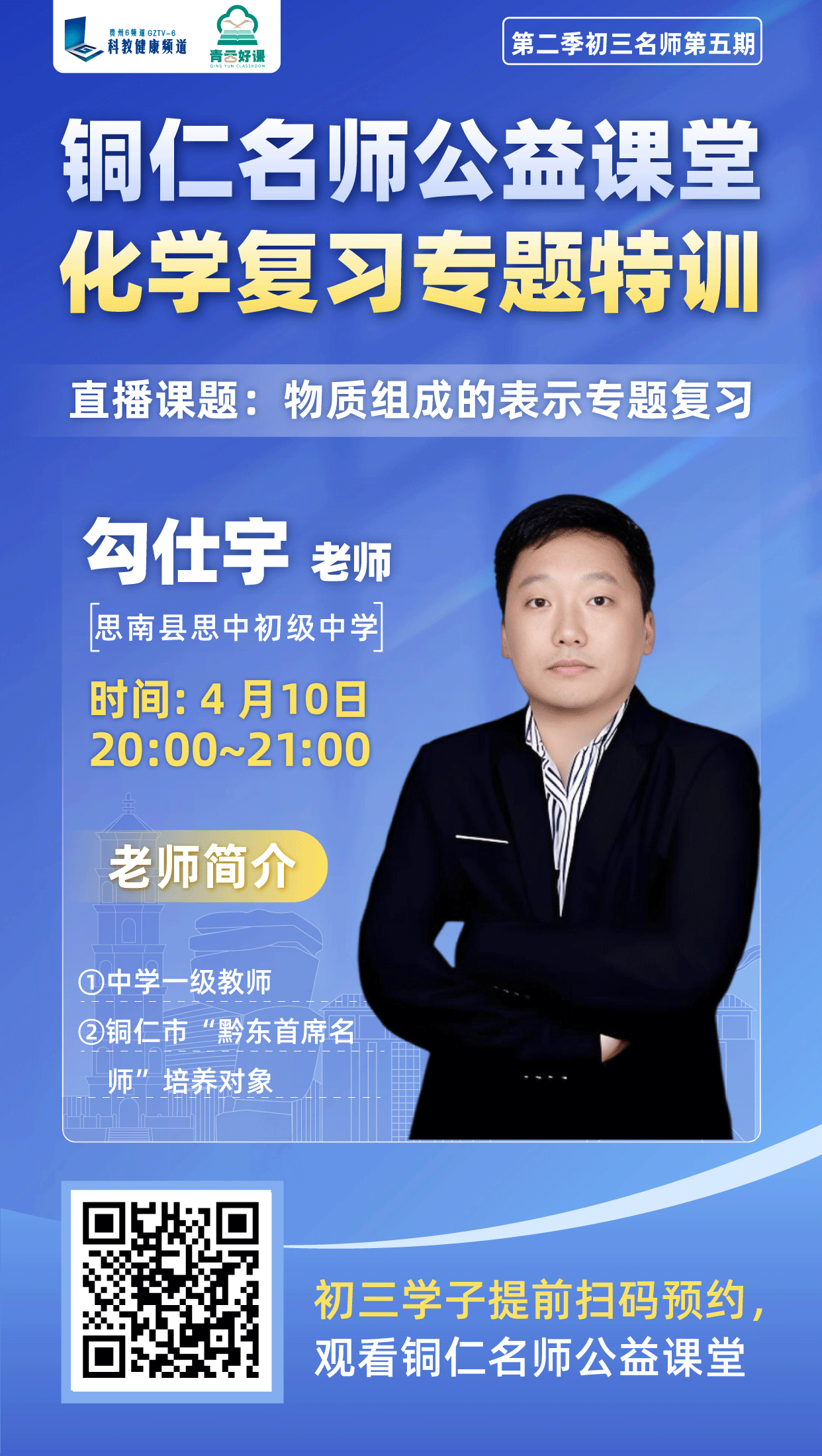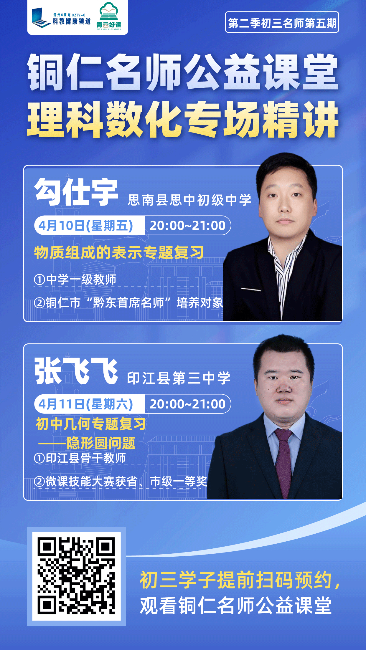青云好课・铜仁名师公益直播课堂第五期直播定于4月10日(周五)20:00-21:00、4月11日(周六)20:00-21:00,由思南县初级中学勾仕宇老师与印江县第三中学张飞飞老师将作为嘉宾亮相直播间!两位优秀教师深耕初中教学一线多年,对中考命题规律、学生易错点及提分策略有着深刻研究,此次他们将以“中考科目核心考点”为主题,结合历年真题案例,拆解高频考点、梳理答题逻辑,帮孩子把“模糊努力”转化为“精准得分”。
