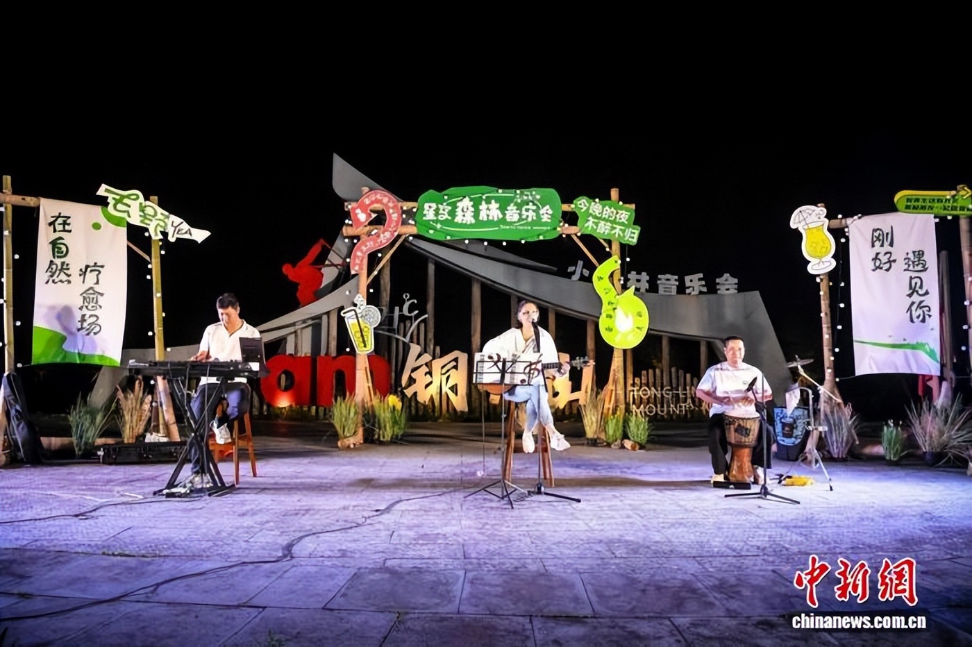 白日的铜铃山镇是山水画卷般的清幽,夜晚则是热闹与浪漫的交织。大草坪上灯光璀璨,星空森林音乐会奏响,悠扬乐声、绚烂灯光与山间清凉晚风相融,成为游客的难忘记忆。