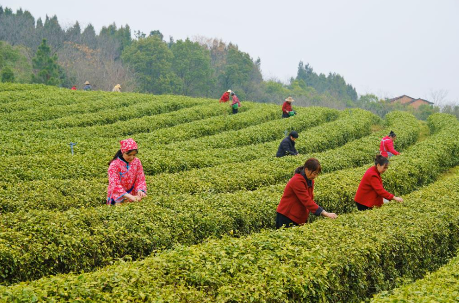 在湖北省天门市陆泉生态茶园,漫山茶树青翠欲滴,游客们腰挎竹篓,在茶农指导下采摘珍贵的“明前茶”。