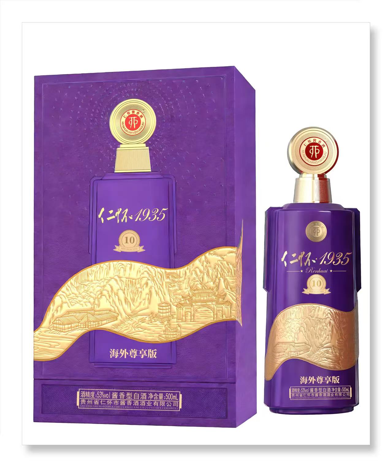 “仁怀1935海外尊享版”在设计上暗藏巧思——瓶身与包装盒以典雅紫色为主色调,醒目标注“海外尊享版”字样,同步搭配英文说明,既彰显专属质感,又精准贴合海外消费者的审美与识别需求。