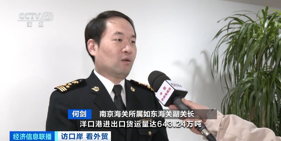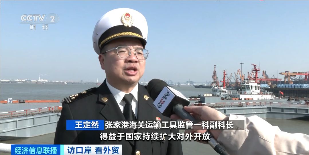 张家港海关运输工具监管一科副科长 王定然:得益于国家持续扩大对外开放,加强了和非洲、中东地区的交流合作,主要是钢材、机电产品、纺织品等,出口同比分别增长55%、4.2%、20.9%。
