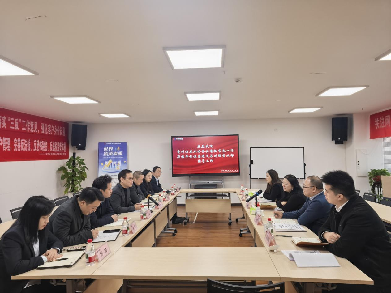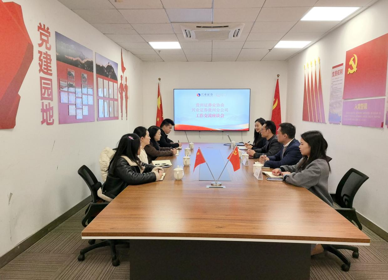 近日,贵州证券业协会秘书处负责人带队赴兴业证券贵州分公司、华创期货贵州分公司、光大证券遵义上海路营业部、华创证券遵义苏州路营业部、贵州省贵文文化基金销售有限公司等会员单位开展走访调研活动,通过面对面座谈交流形式,听实情、问需求、纳良策、促发展。