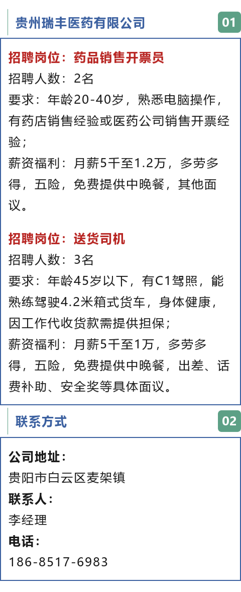 贵阳市白云区招聘送货司机、药品销售开票员!月薪可达12000元!免费提供中晚餐!