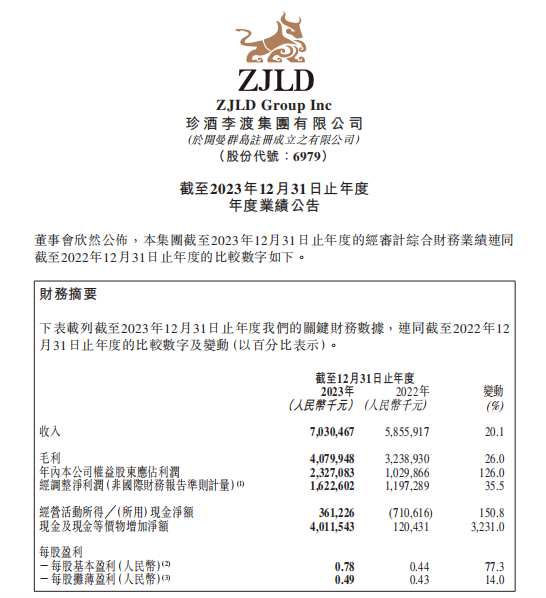 2023年4月27日,珍酒李渡在港交所成功上市,是中国白酒行业近8年来唯一上市企业,并创造了港交所2023年融资规模最大IPO记录,成为2023年度轰动行业内外的现象级事件。在珍酒李渡2023年上半年业绩报告中,营业收入35.19亿元、同比增长15%,当时就给了行业巨大惊喜。此次珍酒李渡上市首份年报,延续2023年上半年营收、净利润两位数增长势头,业绩表现更加亮眼,增长态势更加强劲。