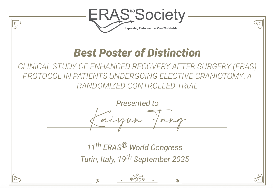 贵州省人民医院由麻醉手术中心方开云老师带队的一行五人组成代表团,远赴意大利参加了此次国际学术盛会,并与国际同仁进行了深入交流。此次会议贵州省人民医院麻醉手术中心共投稿5篇(3篇关于骨科ERAS,2篇关于神经外科ERAS),全部被录用,其中2篇被评为杰出壁报,并进行了交流发言,后续这些被录用的稿件将被发表于国际权威期刊《 ESPEN》。在会议结束后2025-10-02方开云老师收到国际ERAS®的贺信,其团队关于神经外科ERAS的研究:“Clinical Study Of Enhanced Recovery After Surgery (ERAS) Protocol In Patients Undergoing Elective Craniotomy: A Randomized Controlled Trial”经现场交流和专家团队评审,最终斩获“Best Poster of Distinction”殊荣,该殊荣每年只有1名,此次从贵州省人民医院被录用的稿件情况和“Best Poster of Distinction”殊荣的获得,代表贵州省人民医院ERAS不仅走出国门,更是走上了国际舞台,展现了医院在ERAS领域的临床实力与科研成果。