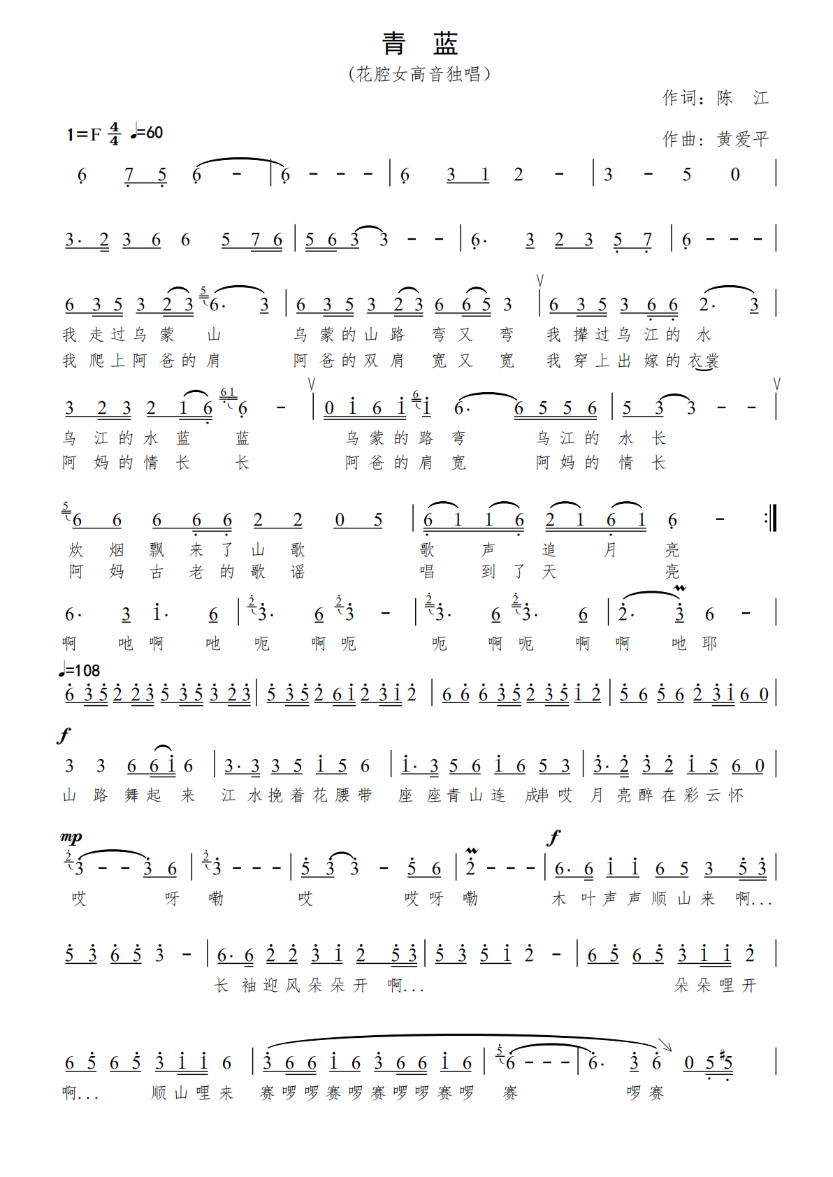 乌蒙青山如黛,乌江碧水如蓝,故名青蓝。歌曲以回忆的方式讲述黔西北一个出嫁的女子对阿爸、阿妈的怀念,出嫁的晚上,阿妈一直歌唱到天亮;那些顺山而来的木叶声声萦绕耳畔,姊妹们的长袖迎风声声呼唤;远去的篝火一直燃烧,翩翩的舞蹈久久徘徊,伴我越过乌蒙山、趟过乌江水、伴我远嫁……